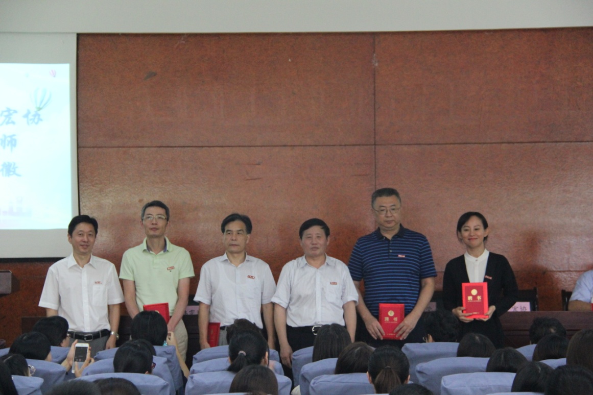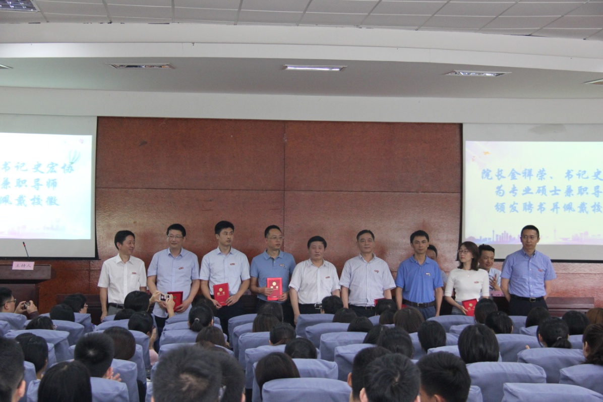 党委书记史宏协宣读2019年学院新聘的62名专业硕士兼职导师名单,并和金院长一起,为21名到场的专业硕士兼职导师代表颁发聘书,佩戴校徽。