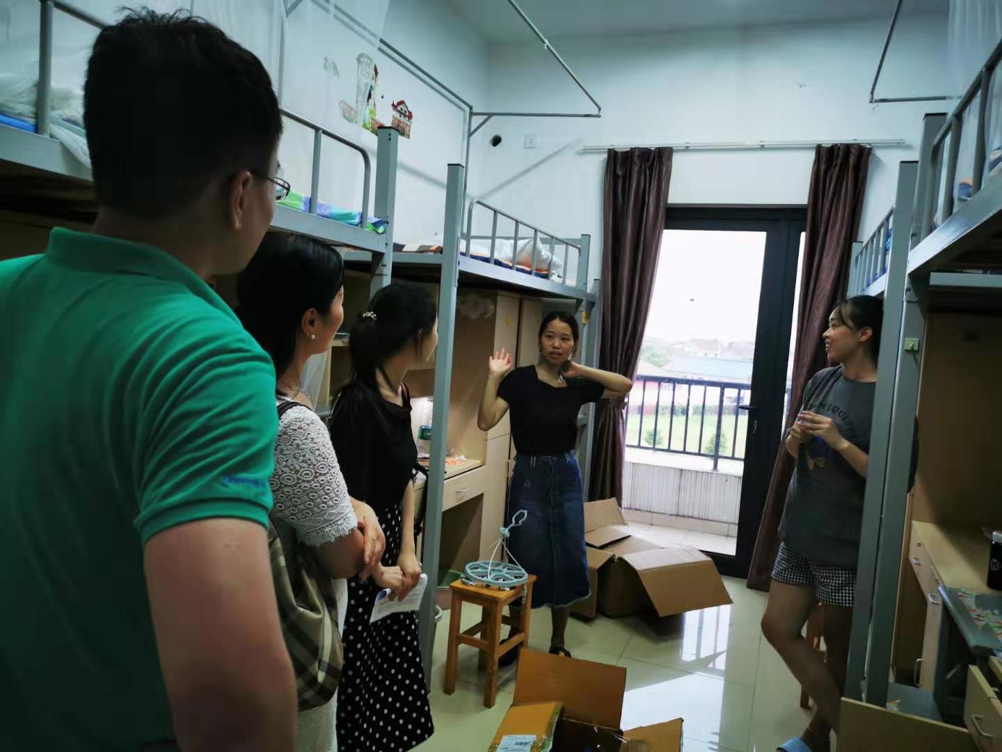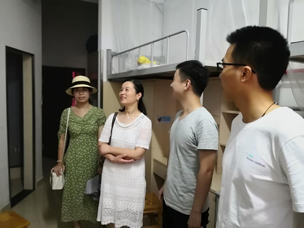 8月28日下午,91制片厂 党委副书记韩雯琛、学工办主任陈彬、国贸经济团队负责人章舒怡、研究生辅导员章浩燕,走进研究生新生寝室和同学们交流。