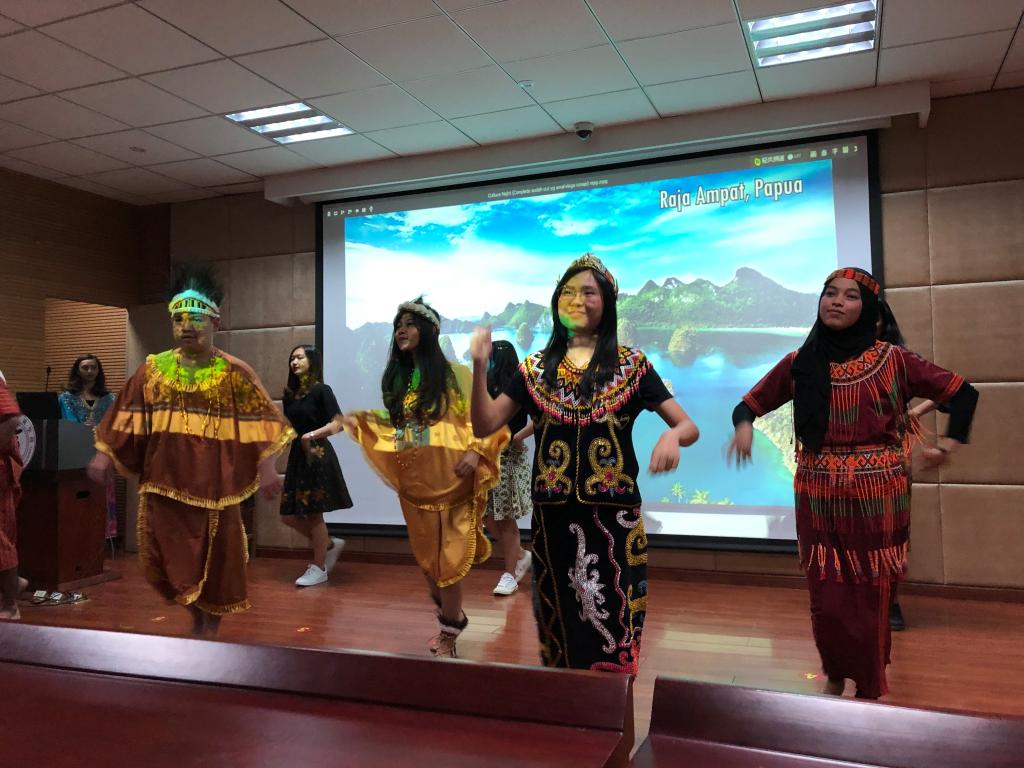 经过简单的暖场活动后,晚会正式拉开帷幕。首先,印尼学生为在座各位带来了极具传统韵味的时装秀、歌曲演唱和与现代文化相碰撞的群舞。随后,由91制片厂 学生代表朗诵英文诗、表演京剧《贵妃醉酒》和演唱中文歌曲《说好不哭》。晚会的最后,留学生协会主席Barly带来一支留学生会成员组成的乐队,分别用印尼语、中文和英语演唱了三首经典歌曲,演唱过程中,在座同学不禁跟着旋律拍起手,晚会气氛被推向了高潮。