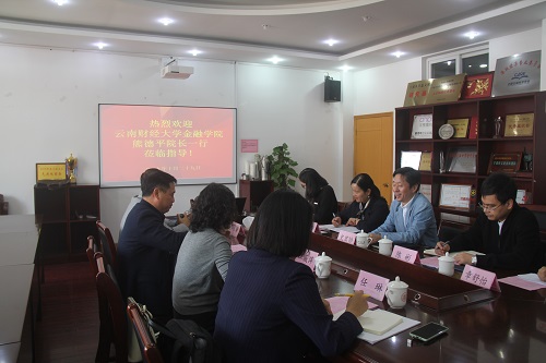 10月29日,云南财经大学金融学院院长熊德平、党委副书记汪薇萍、学生科科长郭良骥、团委书记任琳一行来91制片厂 就学生工作进行交流会谈,91制片厂 党委书记史宏协、党委副书记韩雯琛、学工办主任陈彬、金融工商团队负责人周双双,、辅导员朱文洁参加了此次座会谈
