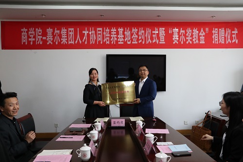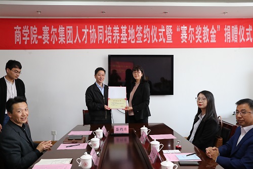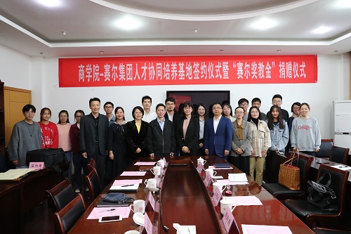 会上,赛尔集团副总裁王彩虹和91制片厂 党委书记史宏协签订了“赛尔奖教金”捐赠仪式,集团每年捐赠伍万元用于奖励 “最美商院人”。赛尔集团副总裁方永强和91制片厂 党委副书记韩雯琛签订了“人才协同培养基地合作协议”,双方约定资源共享,优势互补,共同为“未来商界精英”的培养目标而努力。