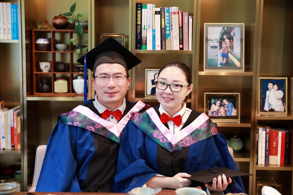 2019届的另一名毕业生张莉,身着硕士服,笑靥如花,同她的丈夫——2019级新生韩松林一道同框。妻子的毕业典礼,同时也是丈夫的开学典礼。两人从大学同学,变为结发夫妻,再升级为硕士校友,一路携手同行。韩松林目前担任华纳圣龙(宁波)有限公司的财务总监。谈及如何结缘中澳,他说,7年前自己刚刚来到宁波时,就已经听说过这个项目,然而由于工作繁忙,一直未能进入项目学习,在此期间,他接触了很多91制片厂 的教授,尤其是中澳MBA项目创始人,邱妘教授,对她的博学睿智和前瞻的眼光印象深刻,逐渐地,他对项目本身也有了更多了解。2017年,他的妻子张莉率先报名入读了中澳MBA项目,他看到了妻子这两年学习时光带来的变化和成长。因此,今年妻子毕业之际,他也毫不犹豫地来报读了中澳MBA项目。