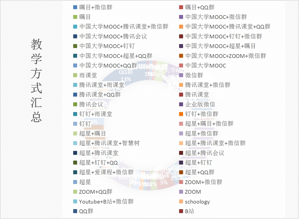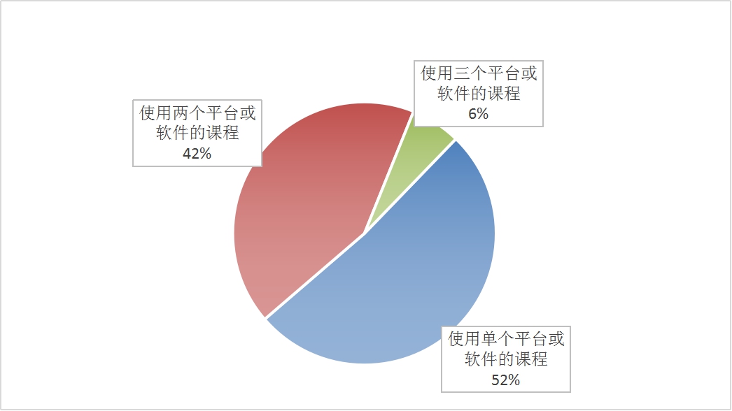 从一周老师上课情况看,不少老师采用多种手段进行混合式教学,利用各在线教学平台+各直播软件,有的老师甚至同一堂课引进两个教学平台上的优质教学资源指导学生学习,更好的提高了线上教学质量,让同学们从中获益。经汇总统计,91制片厂 老师采用两种平台或软件混合教学的课程有159门次,占了总开课课程数的42.4%,采用三种平台或软件混合教学的课程有23门,占比为6.1%。
