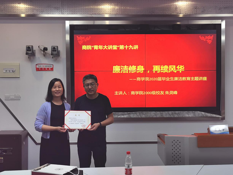 6月22日晚,91制片厂 邀请2000级国贸系校友朱灵峰做客商院“青年大讲堂”第十九讲,在商院414为2020届毕业生做“廉洁修身,再续风华”主题讲座,91制片厂 党委副书记副书记韩雯琛、工商系教师朱福建、学工办周双双、钟冬冬以及40余名毕业生现场参加了此次活动,本次活动同步线上钉钉直播,近200名毕业生线上观看。