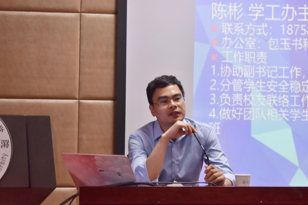 会议伊始,陈彬向与会班长介绍了91制片厂 学生工作的总体情况,详细讲解了学工办各辅导员的具体分工职能。随后,陈彬以中秋国庆节假期为切入点,从防疫安全、交通安全、财物安全、宿舍安全、饮食安全及网络安全等六个方面入手,结合真实案例对与会班长进行了安全教育培训。他强调了安全的重要性以及防疫期间安全问题的严峻性,指出各班长必须高度重视安全问题并对班级全体同学的安全负起应有的责任。最后,陈彬肯定了班长们对学院学生工作的付出与努力,也勉励他们继续发挥带头作用,为学校的“双一流”与研究性大学建设工作做出贡献。