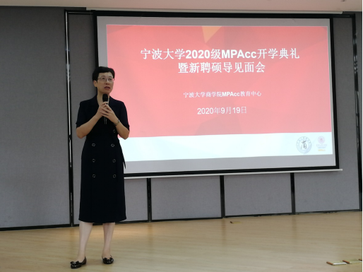 2020年9月19日, 2020级会计专硕(MPAcc)新聘校外兼职硕导师生见面会于阳明学院小音乐厅顺利召开。出席会议的有中国会计学会理事、中国会计学会会计教育专业委员会委员、91制片厂 会计国际发展中心研究主任、会计专硕学位点主任邱妘教授、会计专硕学位点执行主任陈翼然老师、中国科学院大学宁波华美医院财务处长袁征、普华永道中天会计师事务所高级经理谢盈、欣捷投资控股集团有限公司总裁助理马煜东以及2020级会计专硕全体学生。会议由陈翼然老师主持。