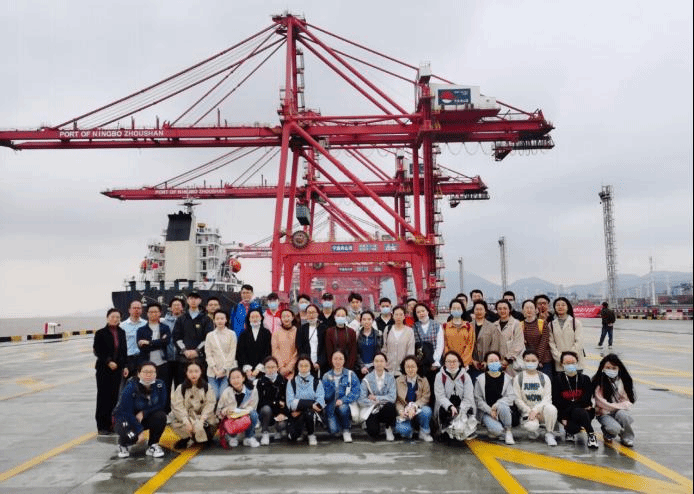 师生在穿山港区1号集装箱泊位合影