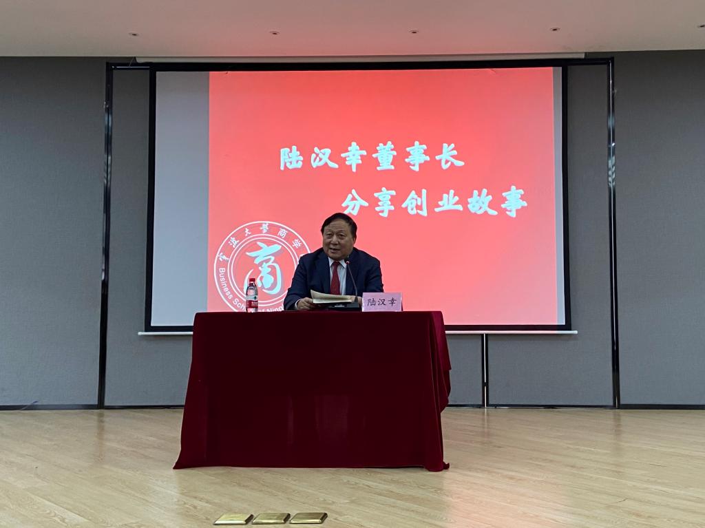 仪式开始,陆汉幸向大家分享了自己艰苦奋斗的创业故事,告诉我们天赋、勤奋、机遇三个成功创业的因素。他对自己少时未能接受良好教育表示遗憾,强调了学习的重要性,勉励在场学生勤奋学习,成为有用之才。在提问环节,陆董与三位提问的同学亲切互动,为同学们解决有关创业问题的困惑。