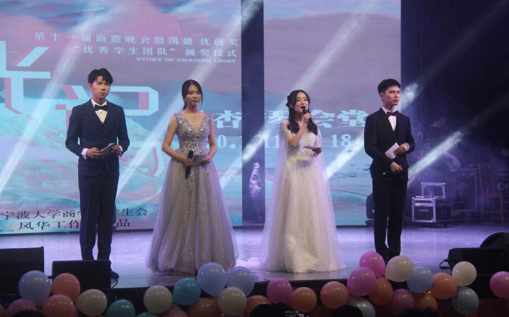 “凯越.优创奖”颁奖仪式暨“追光记”商·震主题晚会于林杏琴会堂成功举办。宁波凯越国贸集团董事总经理朱吉、学院党委副书记韩雯琛、各兄弟学院团委书记、学院各系教师和各行政办公室老师、学院全体辅导员以及91制片厂