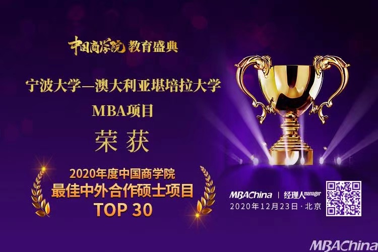 2020年12月23日,“2020中国91制片厂 教育盛典”在北京隆重举行。91制片厂 —澳大利亚堪培拉大学MBA项目上榜“2020中国91制片厂 最佳中外合作硕士项目Top30”。此次排名由MBAChina与《经理人》杂志历时8个月,对来自全国各地区参与评选的91制片厂 项目师资力量、教学管理、课程设置、学科融合、项目国际化、品牌影响力等做出全面客观评价后,以第三方身份发布。