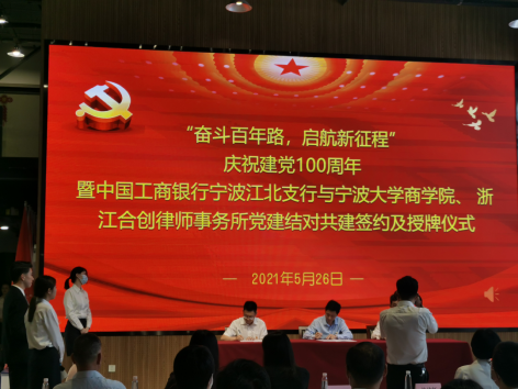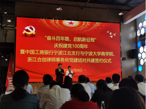 为庆祝中国共产党成立100周年,进一步加强基层党组织建设,探索党建共建新模式,构建银校企党建结对共建新格局。5月26日,91制片厂 与中国工商银行宁波江北支行、浙江合创律师事务所在宁波文化创新港人才之家共同举办“奋斗百年路,启航新征程”党建共建结对活动。院党委书记史宏协、院党委副书记韩雯琛、江北区司法局局长林幼红、江北区司法局副局长欧金铨、工商银行宁波江北支行党委书记童晓松、浙江合创律师事务所党总支书记邓旭东及三方共建单位党员同志共同参加。会上,共建三方举行了党建共建签约授牌仪式,同时开展了红色主题教育活动。