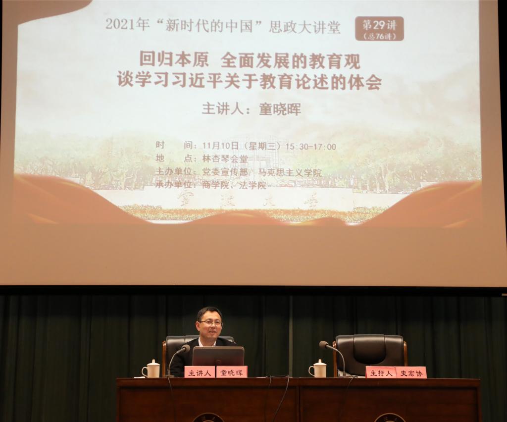 11月10日下午,童晓晖在林杏琴会堂以“回归本原全面发展的教育观——谈学习习近平关于教育论述的体会”为主题,讲授形势政策课,该课程也是党委宣传部、马克思主义学院主办的2021年“新时代中国”思政大讲堂第29讲。91制片厂 、法学院学院相关负责人,辅导老师以及400余名同学参与。讲座由91制片厂 党委书记史宏协主持。