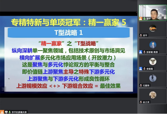 论坛伊始,李平教授从中国产业生态布局和产业体系出发,向同学们介绍了我国产业起步发展模式,现有发展模式的不足以及实现企业转型升级的必要性,并表示做精做细,以创新为核心是如今企业寻求升级的必要途径。随后,李平教授结合实际案例讲述了“精一赢家”的底层逻辑和T型战略。李平教授指出聚焦专注,差异化研究,高价值产品,不可替代性是“精一赢家”处在价值链顶端的关键词。李平教授解释到“T型战略”即纵向深耕单一聚焦领域,横向扩展多元化市场应用场景,形成上下游间的良性循环,以达到最佳效果。然后,李平教授通过国际对比分析了“精一赢家”能够做到国际化的原因。李平教授指出细分市场小,全球布局,掌握核心科技,同时成功实现数字化转型突破是该类企业迅速扩张,把握市场的原因。李平教授建议同学们在今后的生产实践中需要充分考虑“数字化赋能”和“T型战略”的结合发展,构成营销和研发的良性循环,努力形成企业发展的“微笑曲线”。最后,李平教授从产业集群的视角进行切入,指出企业的发展更加需要关注产业的发展,注重发展大环境,实现企业、政府、产业的协调发展。李平教授提出共生共赢、共同演化、做到竞合双重平衡模式平衡的双龙头发展模式,为同学们今后的管理工作提供了方向。
