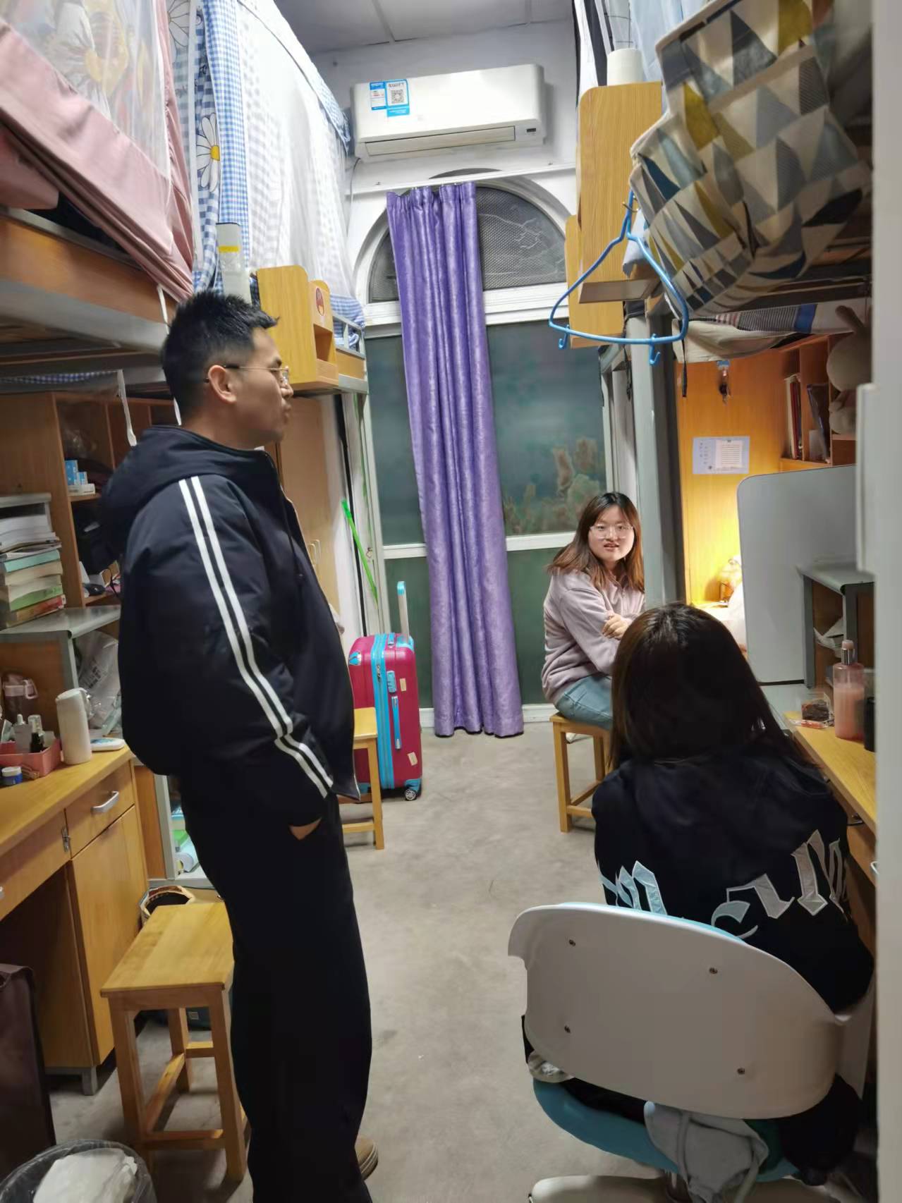 在寝室走访过程中,辅导员们与同学们亲切交谈,详细了解当前同学们的生活和学习状况,引导同学们从科学的角度看待疫情防控,思想上不松懈、行动上稳落实,克服麻痹思、侥幸心理和松劲心态,警钟长鸣。走访期间,老师们叮嘱同学们疫情期间要严格遵守学校疫情防控相关规定,“非必要不离校,离校必须请假”,保证今日校园每日百分百打卡。