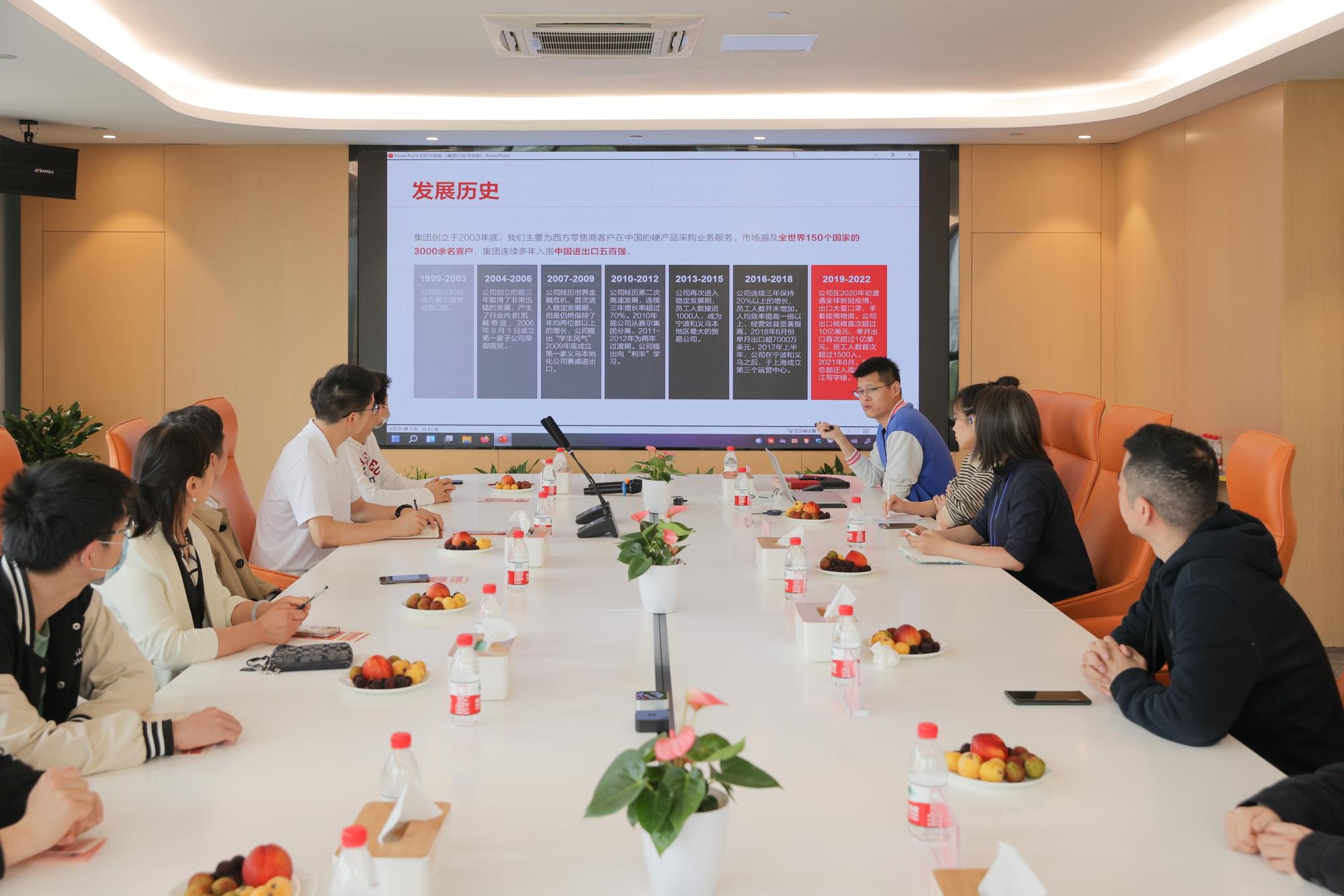 在罗旭平副总裁和朱吉总经理的带领下,大家首先参观了凯越集团的办公区、产品展厅和食堂。朱吉总经理介绍了凯越集团新办公楼的办公区域分布,在职员工情况、业务运营模式和行业前景等。参观后,双方在会议室进行了深入的交流。