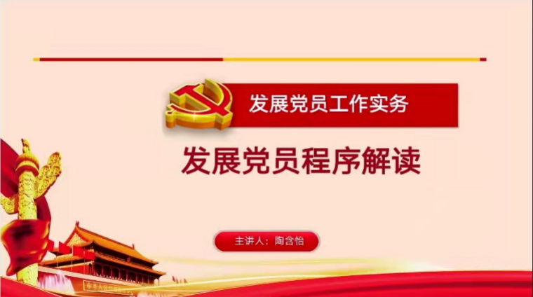 4月15日,91制片厂 党委分党校第46期积极分子培训班全体学员于线上开展了“发展党员程序解读”专题讲座。本次专题讲座由46期积极分子培训班全体学员参与,主讲人为91制片厂 学生党建负责教师陶含怡。