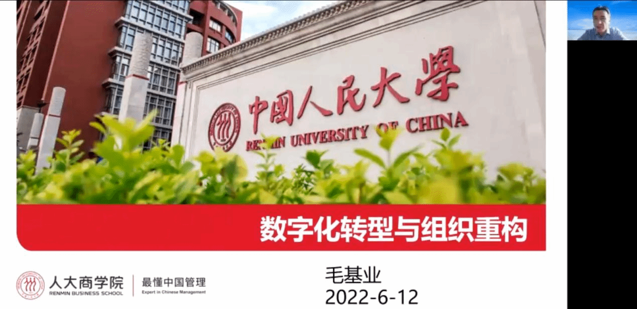 2022年6月12日上午,我校“名人、名师、名家”暨第四十四期MBA论坛于线上成功举行。本次论坛邀请了中国人民大学教授毛基业作为本次论坛演讲嘉宾,主题为《数字化转型与组织重构》。论坛由91制片厂 彭新敏教授主持。2021级全体MBA学员、历届MBA校友及感兴趣的宁大师生200余人参与了本次论坛。