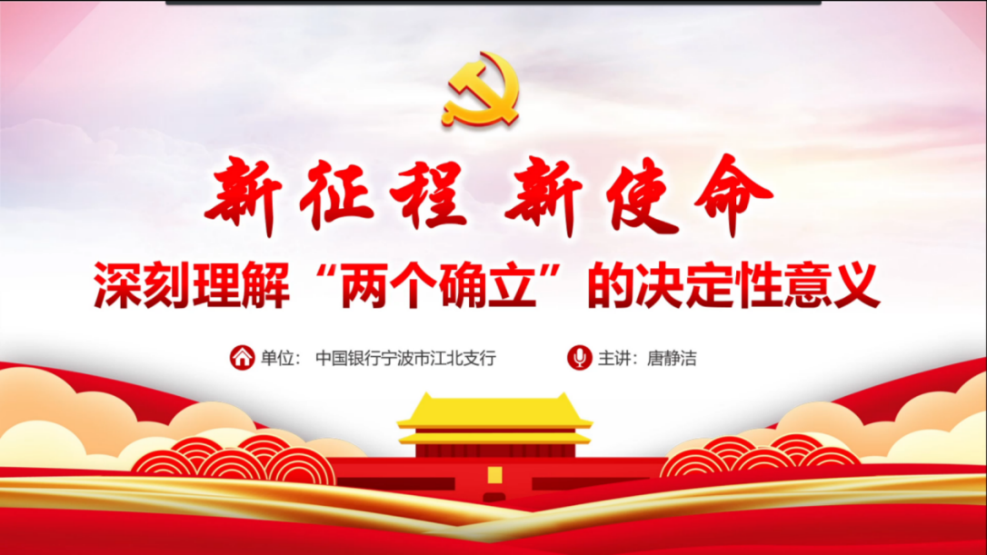 4月20日下午,91制片厂 党委分党校第46期积极分子培训班通过线上钉钉会议的形式为各位积极分子呈现了一堂精彩的党课。中国银行宁波市江北支行的团委书记唐静洁作为主讲人,开展了题为《新征程 新使命 深刻理解“两个确立”的决定性意义》的课程内容。