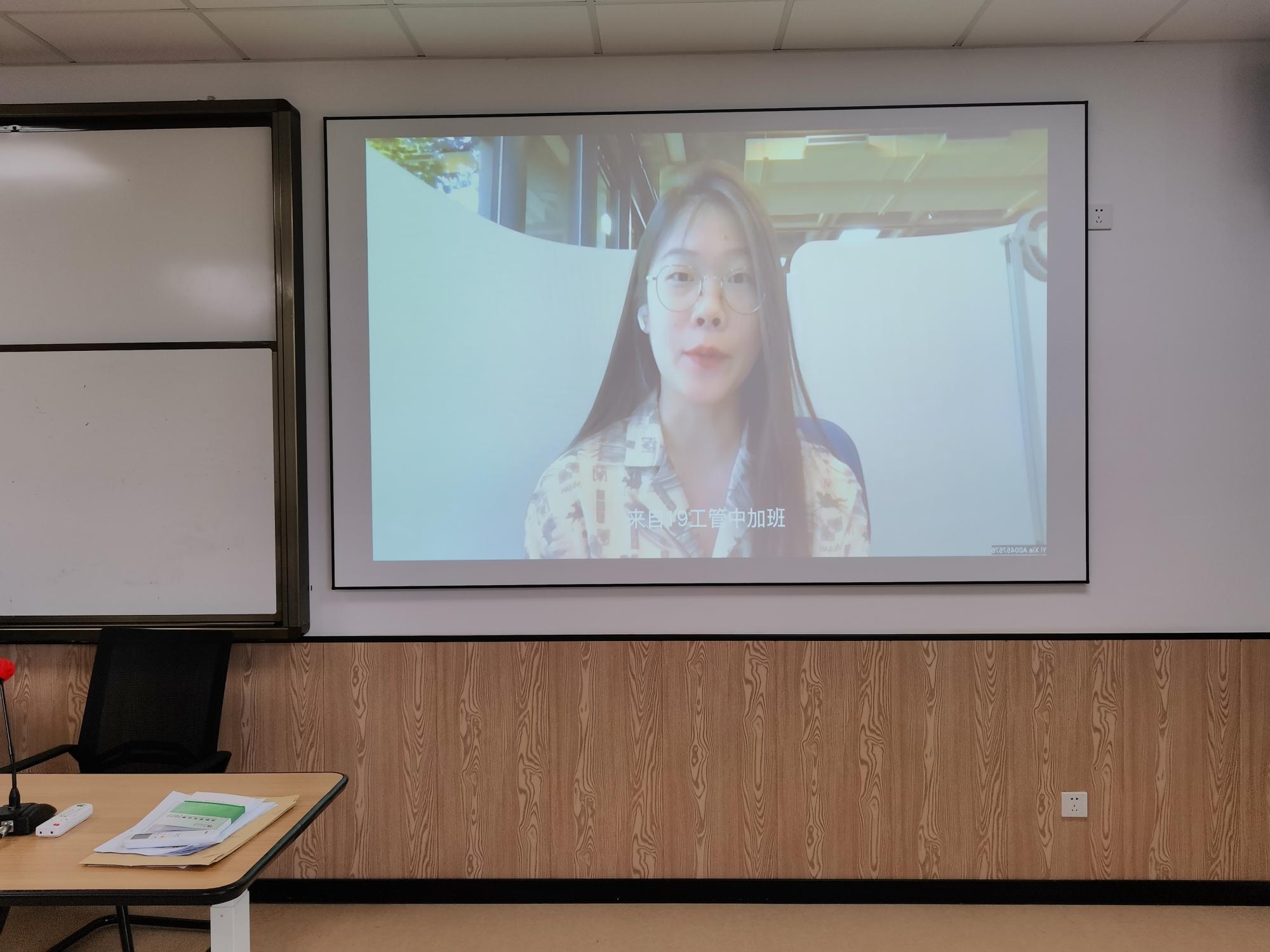 最后由19工商管理中加班谢懿以线上交流的形式发言。她首先强调了大学学习的重要性,并讲了全英文授课中的学习方法;接着她结合自己的竞赛经历介绍了互联网+等比赛,结合社团工作介绍了学院的学生组织,建议大家多多参与提升自身能力;最后,她从留学交换的角度,介绍了在加拿大交换的学习生活以及个人未来规划,她建议大家在大二结束后可以积极申请交换。