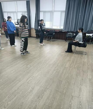 形体培训中,王如意细心教授站姿,走路姿势等相关形体知识,同学们认真学习并进行实践练习。