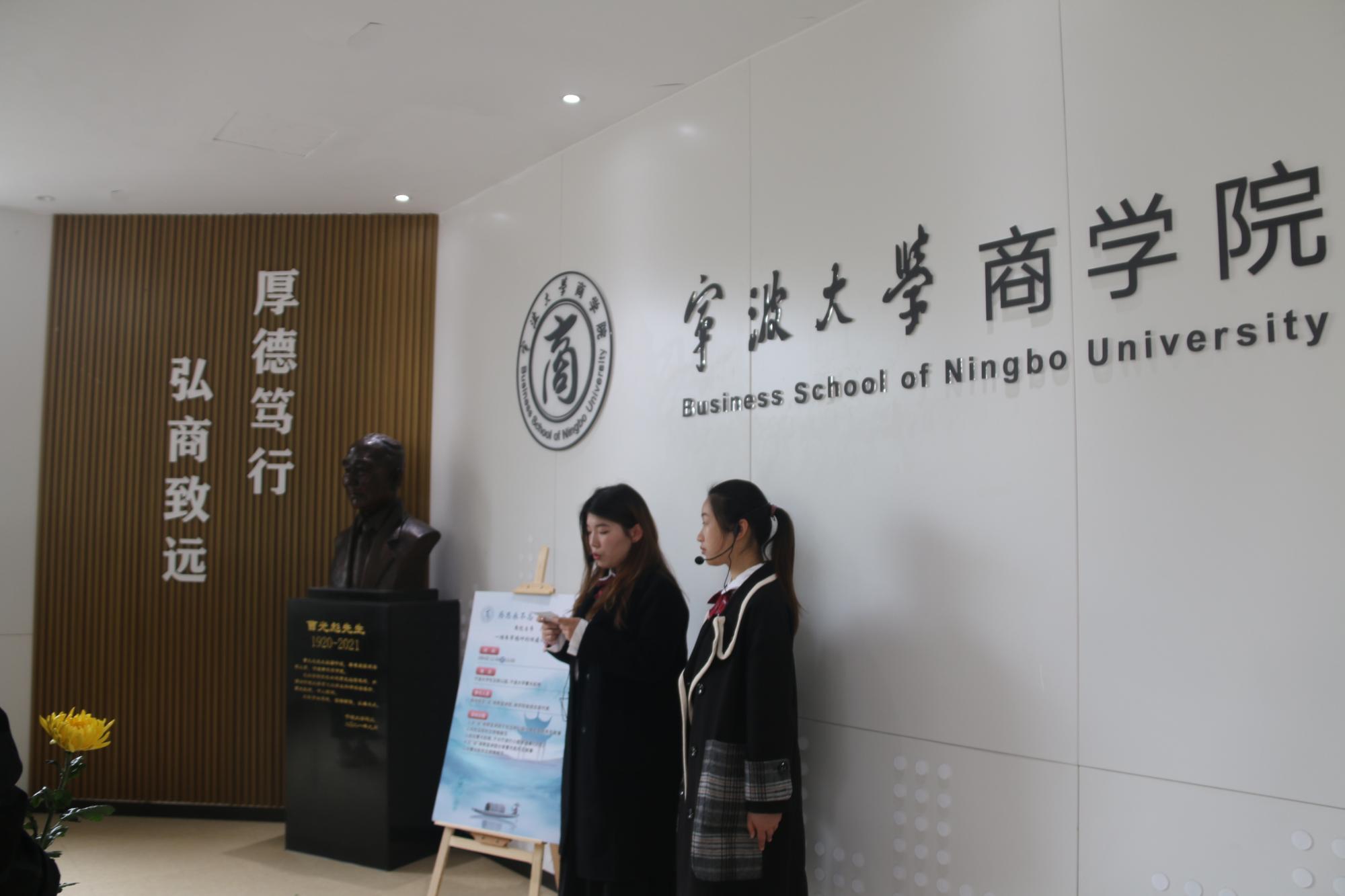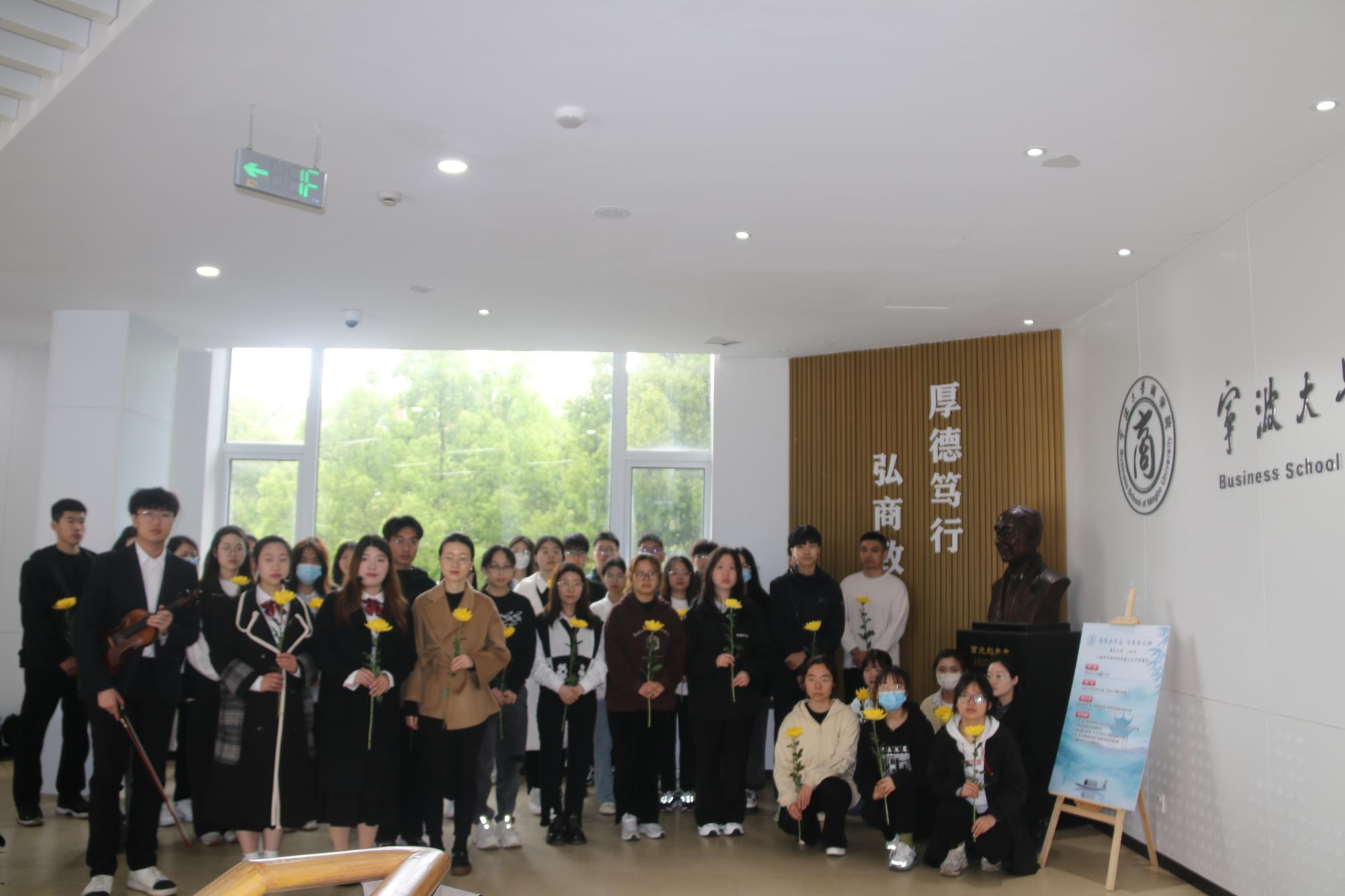 随后,一行人前往曹光彪楼,于大厅欣赏小提琴独奏《沉思》。一曲终了,文“话”商帮宣讲团分享了曹光彪先生的故事,“桃李不言,下自成蹊,斯人已逝,星火相传。感谢曹光彪先生为91制片厂 做出的无私贡献,为我们提供更好的教育资源,我们要感谢曹光彪先生,牢记宁波帮人士的付出,学习弘扬宁波帮精神”。宣讲团成员胡馨尹的话语久久萦绕在同学们耳边。仪式现场,同学们有序地在曹光彪先生铜像前献上献花。