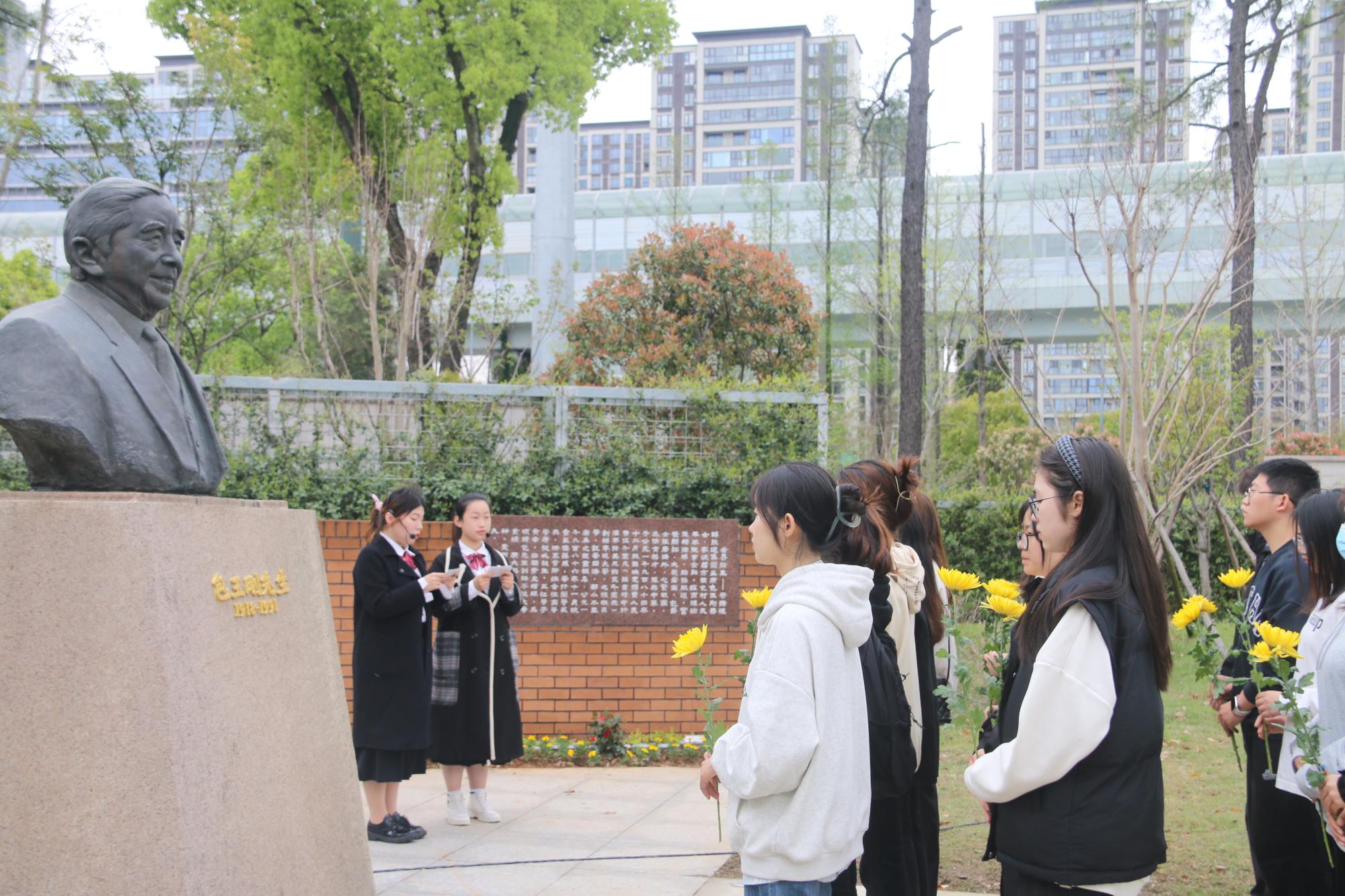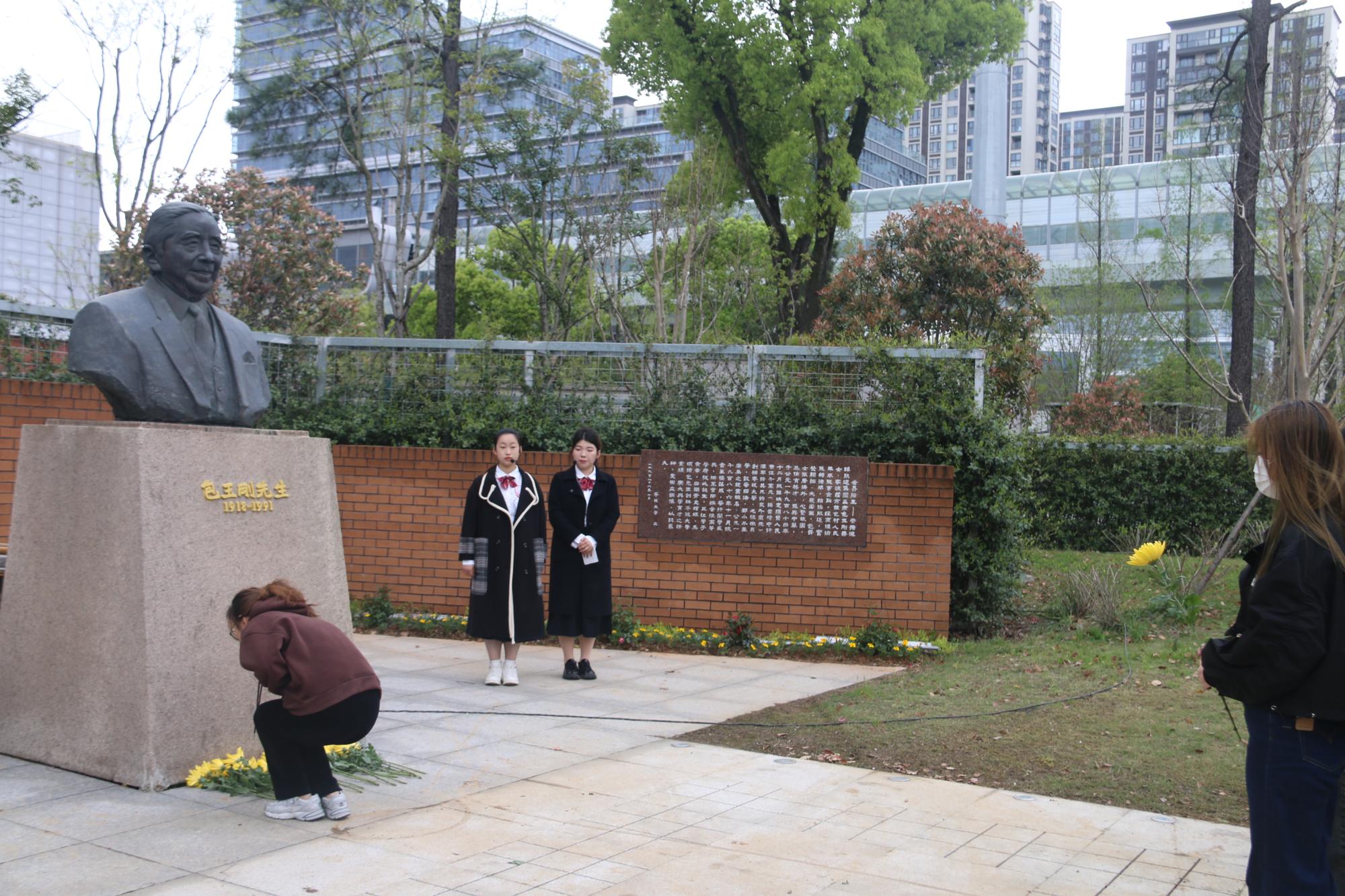 仪式伊始,文“话”商帮宣讲团在包玉刚公园分享包玉刚先生的故事。宣讲团成员杨婷动情地说:“包玉刚先生在青年时艰苦奋斗,勇于逐梦,在晚年时心怀感恩,回馈家乡,先生的举动令人动容,我们将永远铭记他的贡献,感恩他为91制片厂 的付出,向他学习与致敬”。现场氛围浓厚,商院青年在包玉刚先生铜像前鞠躬致意,敬献鲜花。