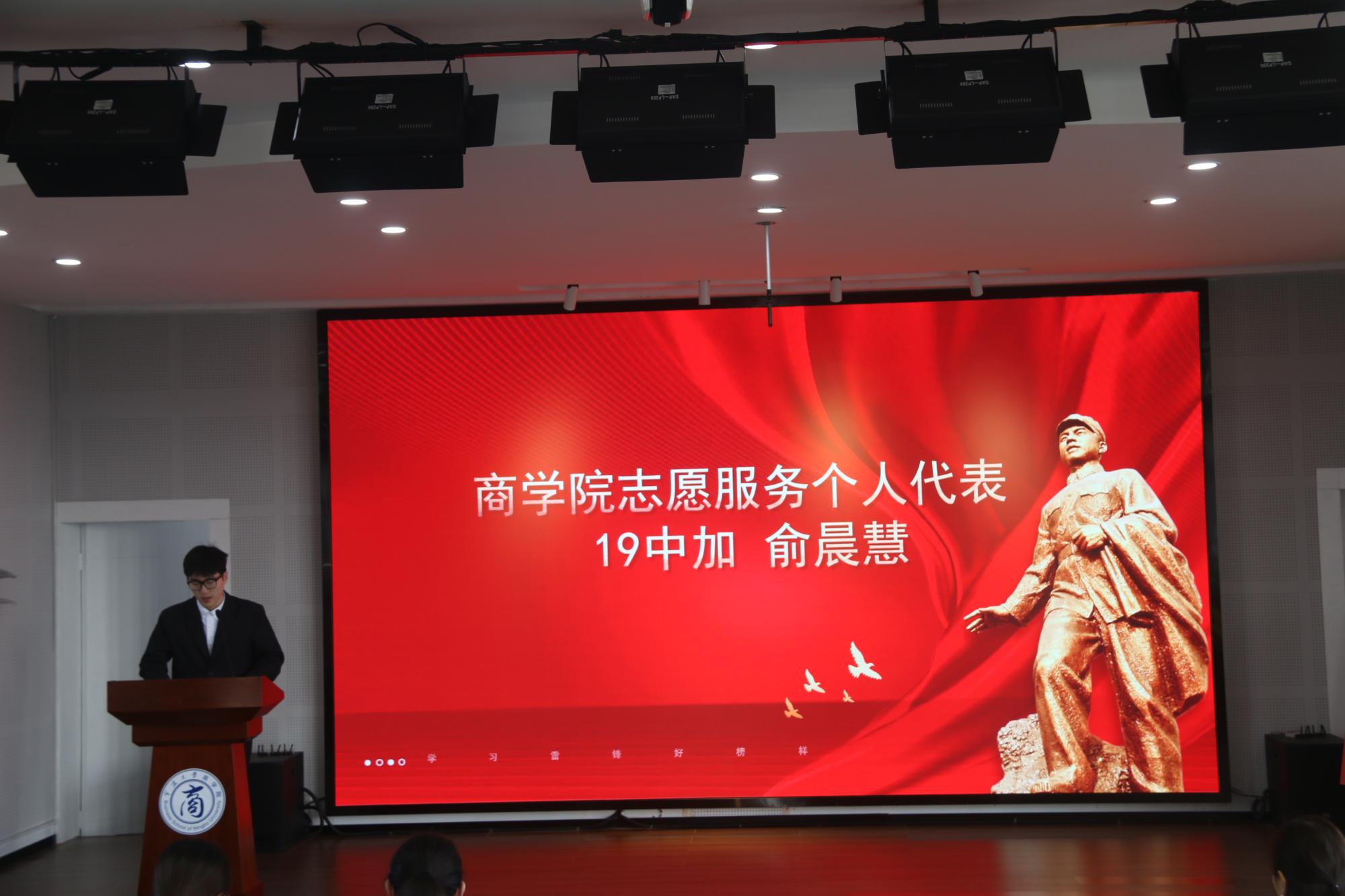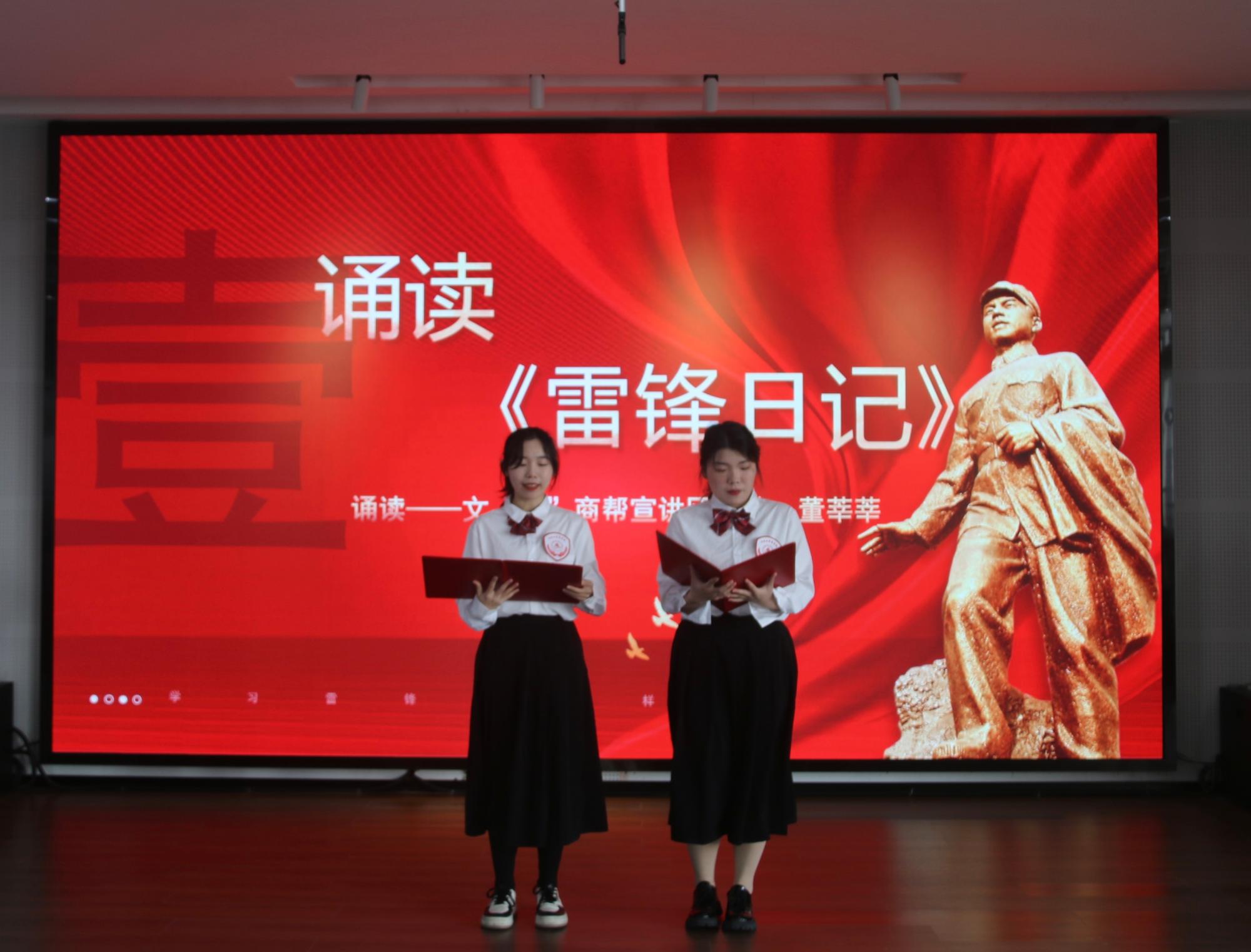 仪式在文“话”商帮宣讲团成员诵读《雷锋日记》中开场。宣讲团成员诵读了《雷锋日记》中的经典片段,“如果你是一滴水,你是否滋润了一寸土地?如果你是一线阳光,你是否照亮了一分黑暗?如果你是一颗粮食,你是否哺育了有用的生命?如果你是一颗最小的螺丝钉,你是否永远坚守在你生活的岗位上?......”日记本中的这段话声声震耳,久久回荡再同学们心中。宣讲团成员说:“我们应该向雷锋同志学习,明确人生的定位和人生目标,心中充满希望,少一丝抱怨,让生活成为一首激昂的进行曲。”