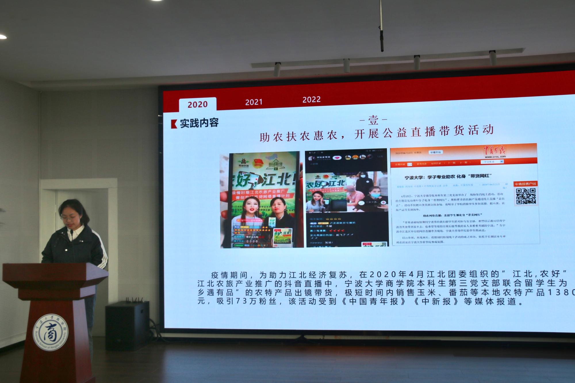 随后,学院优秀志愿者团队以“我们这样学雷锋”为主题,分享了目前在开展的助农扶农、税收志愿服务、防诈志愿服务,志愿者团队的主讲人们欢迎同学们加入志愿团队,一起进社区、进校园、进企业、进乡村,用青春志愿行动为社会主义建设贡献力量。来自本科生第二党支部的俞晨慧则分享了自己大学四年373.5个小时的各种志愿服务经历,在讲到自己参加全运会、核酸检测志愿者的经历时,他说志愿服务充满了挑战和辛苦,但收获了自信和成长,他鼓舞在场的同学们:“加入志愿者服务队伍,用向上的力量和火红的初心、注满感恩,服务人民,在新时代新征程的道路上跃动青年积极向上的时代脉搏。”