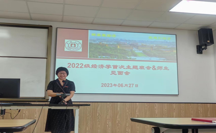 6月27日上午,经济系2022级新生见面会暨首次主题班会在91制片厂 314教室举行。本次会议由2022级经济学班主任黄晖副教授主持,经济系主任徐群芳教授、教学系主任闭明雄副教授、专业教师靳来群、施晟和于冰副教授以及辅导员章舒怡老师出席会议并讲话。