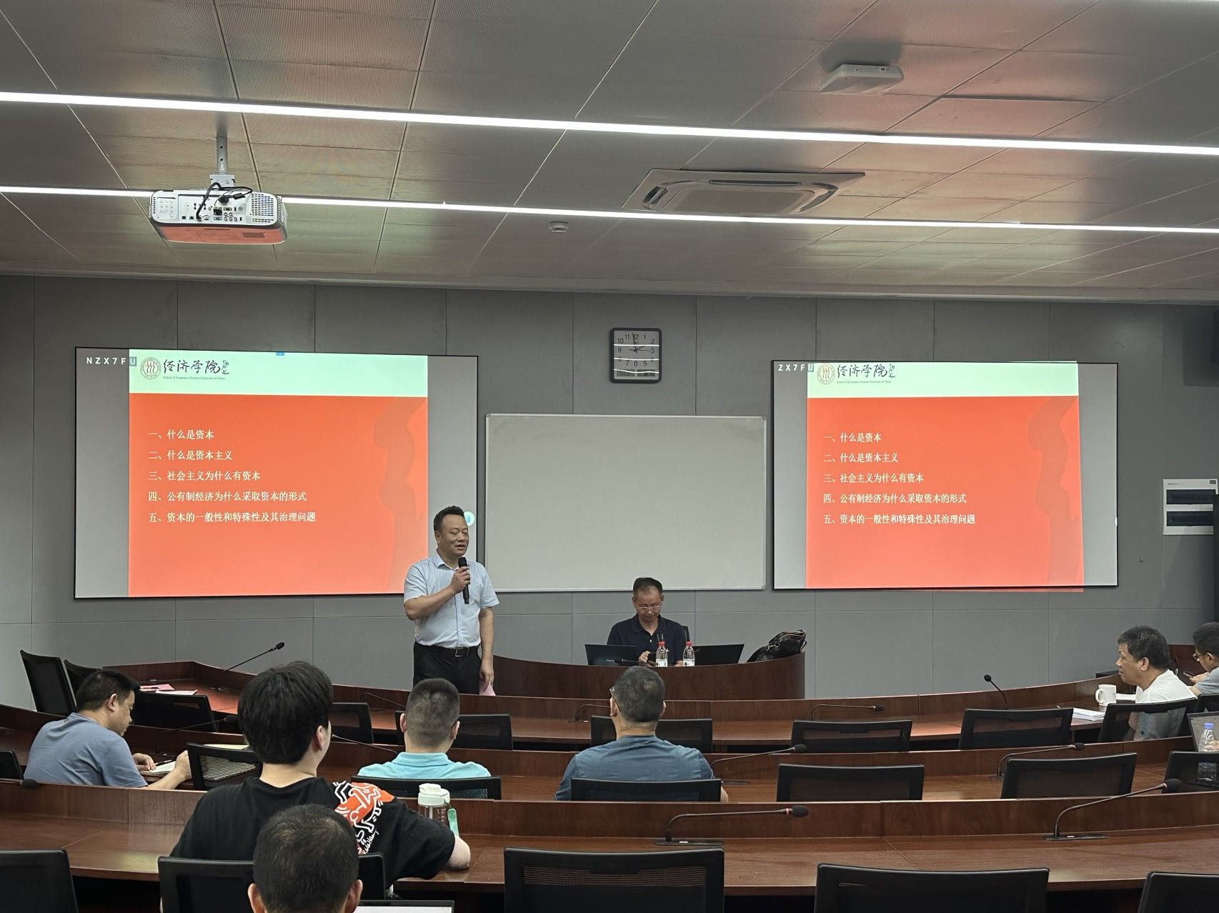 本次研修班主要由两个部分组成,第一部分为中国人民大学经济学院邱海平教授开展主题为“关于社会主义市场经济条件下的资本问题”的学术报告。在91制片厂 陈涛副院长的主持下,邱教授从习近平新时代中国特色社会主义理论出发,讲述在中国社会环境下的资本与资本主义的基本定义,以及资本主义存在的一定合理性,深入分析当前我国公有制经济采取资本形式的原因,并对资本主义在中国特色社会主义道路下的治理问题提出自己的独到见解。