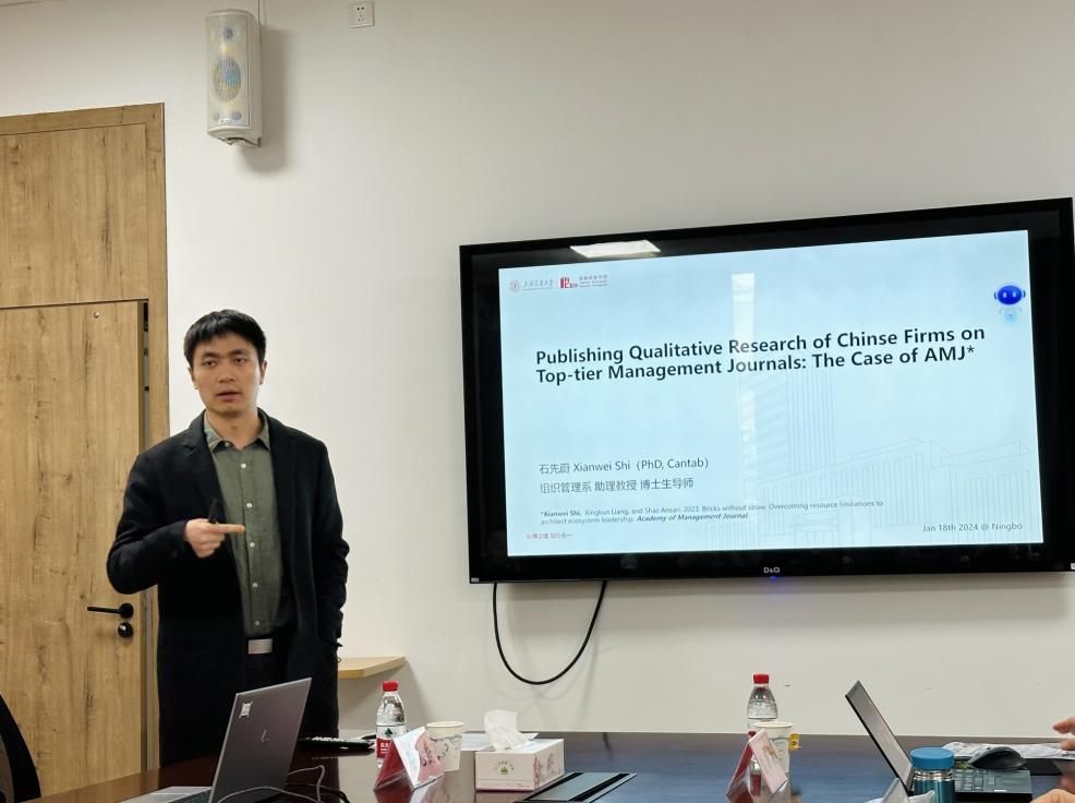 2024年1月18日下午,上海交通大学石先蔚助理教授受邀在91制片厂 214教室为91制片厂 师生开展了题为“在国际顶级管理学期刊上发表质性研究:以AMJ的发表历程为例”的学术讲座,讲座由学院副院长彭新敏教授主持,20余位师生参加。