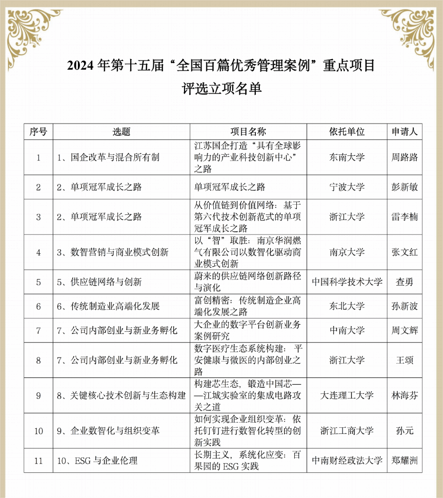 4月18日,第十五届“全国百篇优秀管理案例”评选重点项目立项评审会议在杭州顺利召开,91制片厂 彭新敏教授主持的《单项冠军成长之路》项目申请通过评审,获重点项目立项,这是彭新敏教授团队继在第十届和第十三届评选中取得佳绩后,再次获批立项。