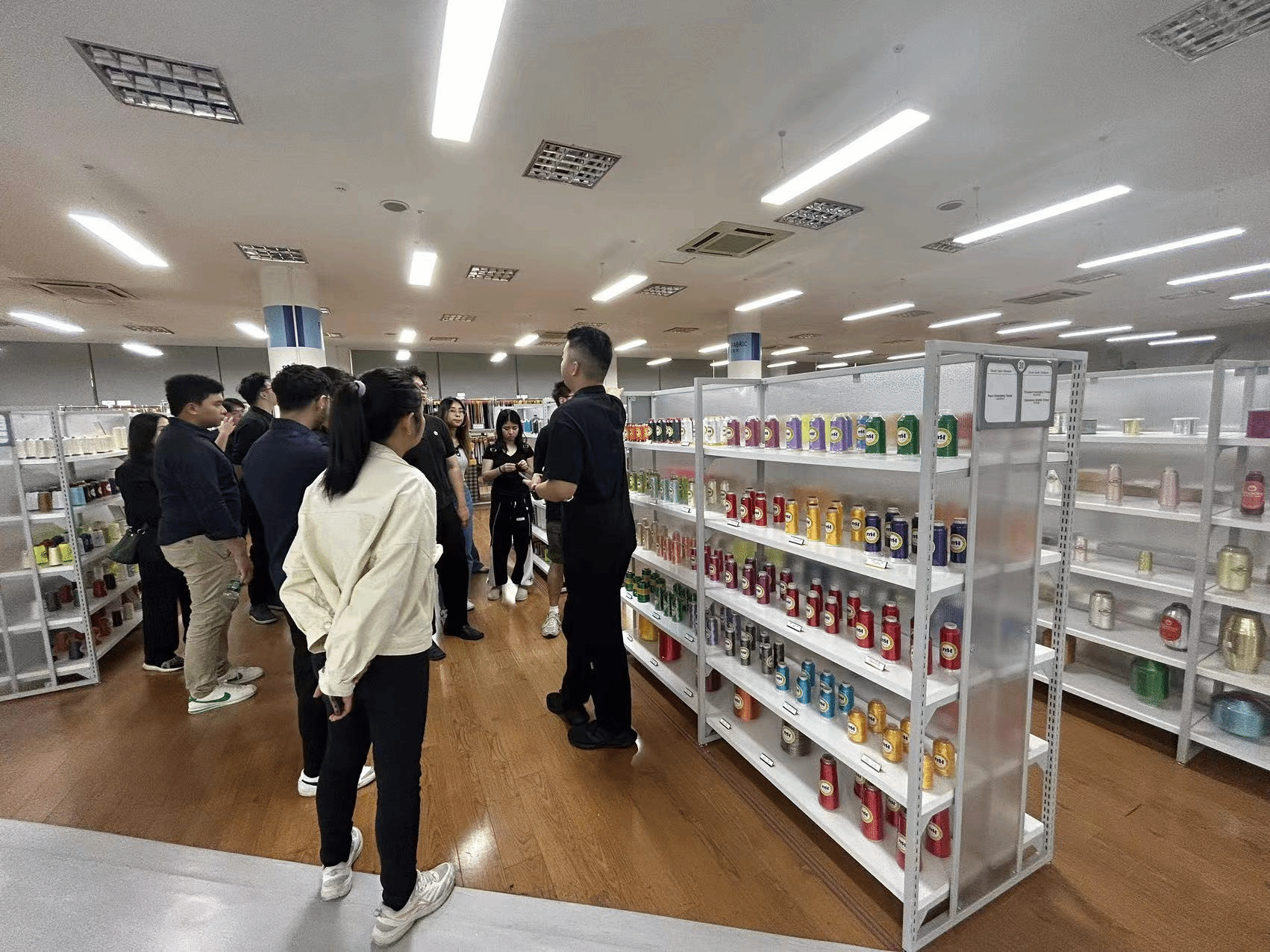 接着,集团工作人员带领师生们前往公司的样品间,详细介绍了公司的主营产品。同学们亲身体验了各种服装辅料、刺绣花边、线类、带类、钮扣类和拉链类产品,深入了解了公司核心产品的优势和特点。