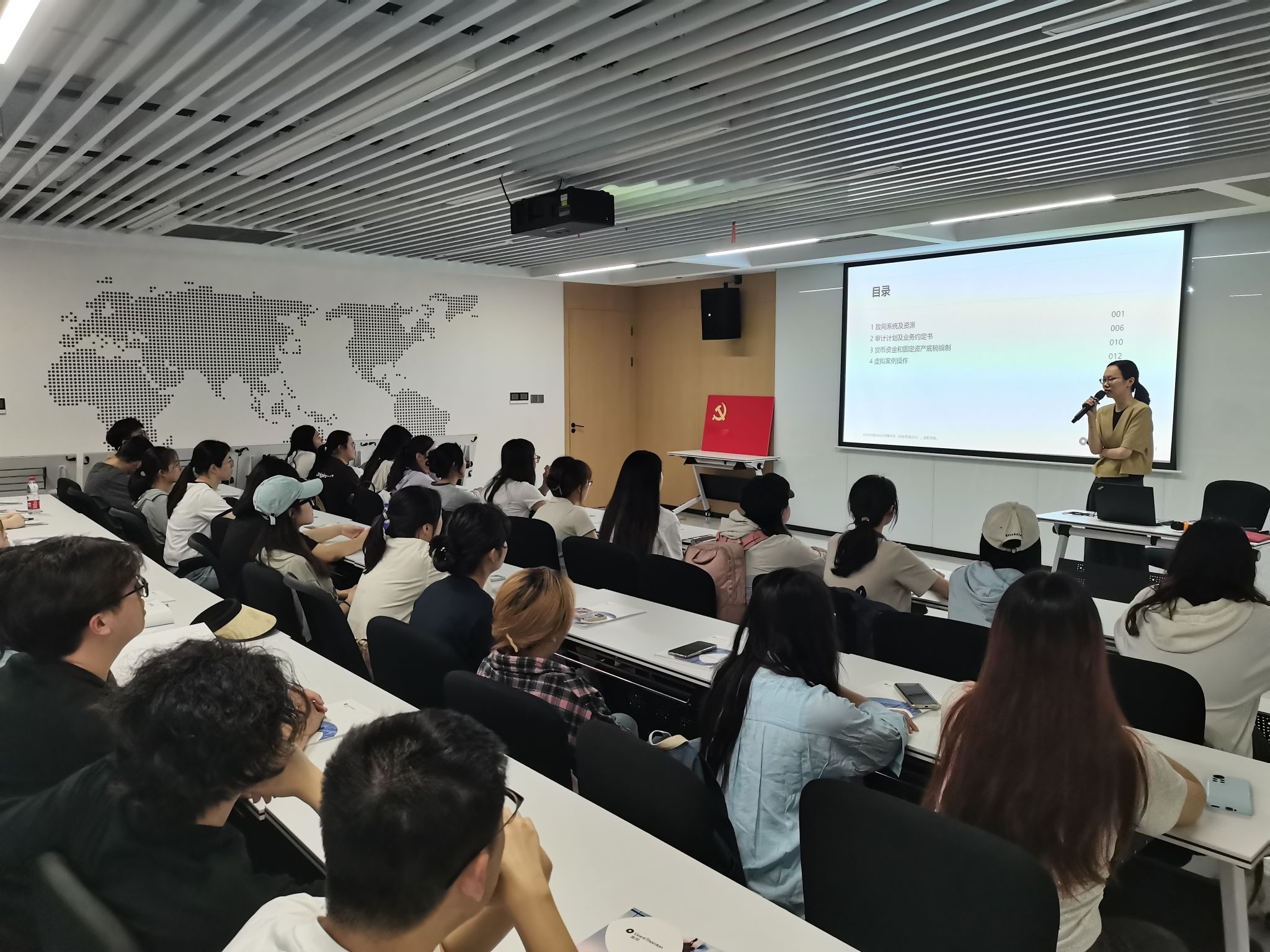 在致同会计师事务所,同学们参观了办公区域,集中在会议室观看致同所专题介绍。之后,周丹老师介绍了致同所使用的办公软件和审计作业系统,重点讲解了审计计划和审计业务约定书等审计工作底稿的编制方法。同学们随后参与相关审计业务底稿的编制。
