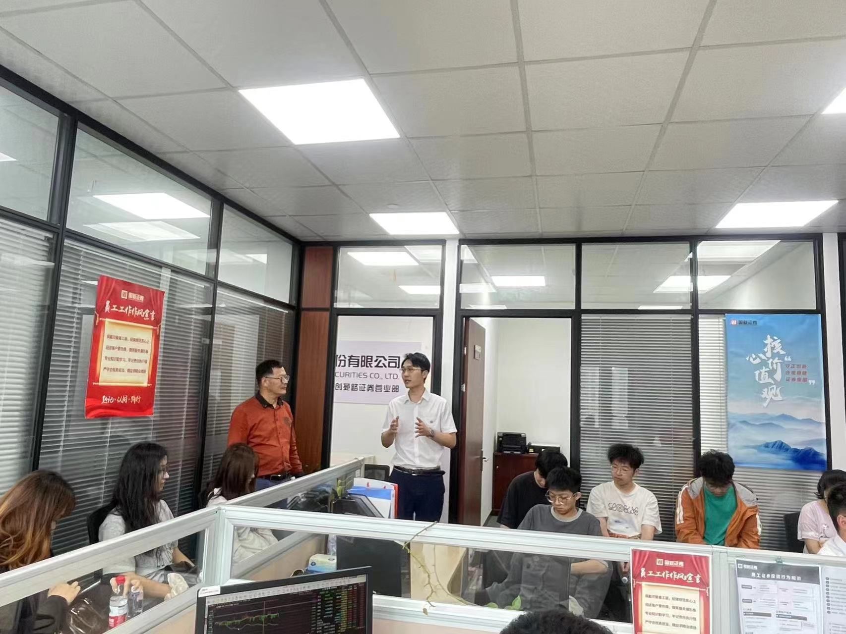 在国新证券营业部,同学们围坐在狭长的办公室周围,饶有兴趣地听取营业部负责人王哲经理热情洋溢的讲话,了解到证券业务的主要类型和特点。国新证券实控人为成立于2010年12月份的中国国新,是国务院国资委监管的中央企业之一,截至2023年底,公司资产总额超9000亿元;全年利润总额连续三年保持在200亿元以上。2019-2022连续四年获年度中央企业负责人经营业绩考核A级。随后,王经理指导同学们认真研读证券公司财务报表,结合业务进行讲解和分析。同学们不时地提出相关问题,并展开热烈讨论。接下来,同学们分组对证券公司财务报表进行分析,并进行报告。