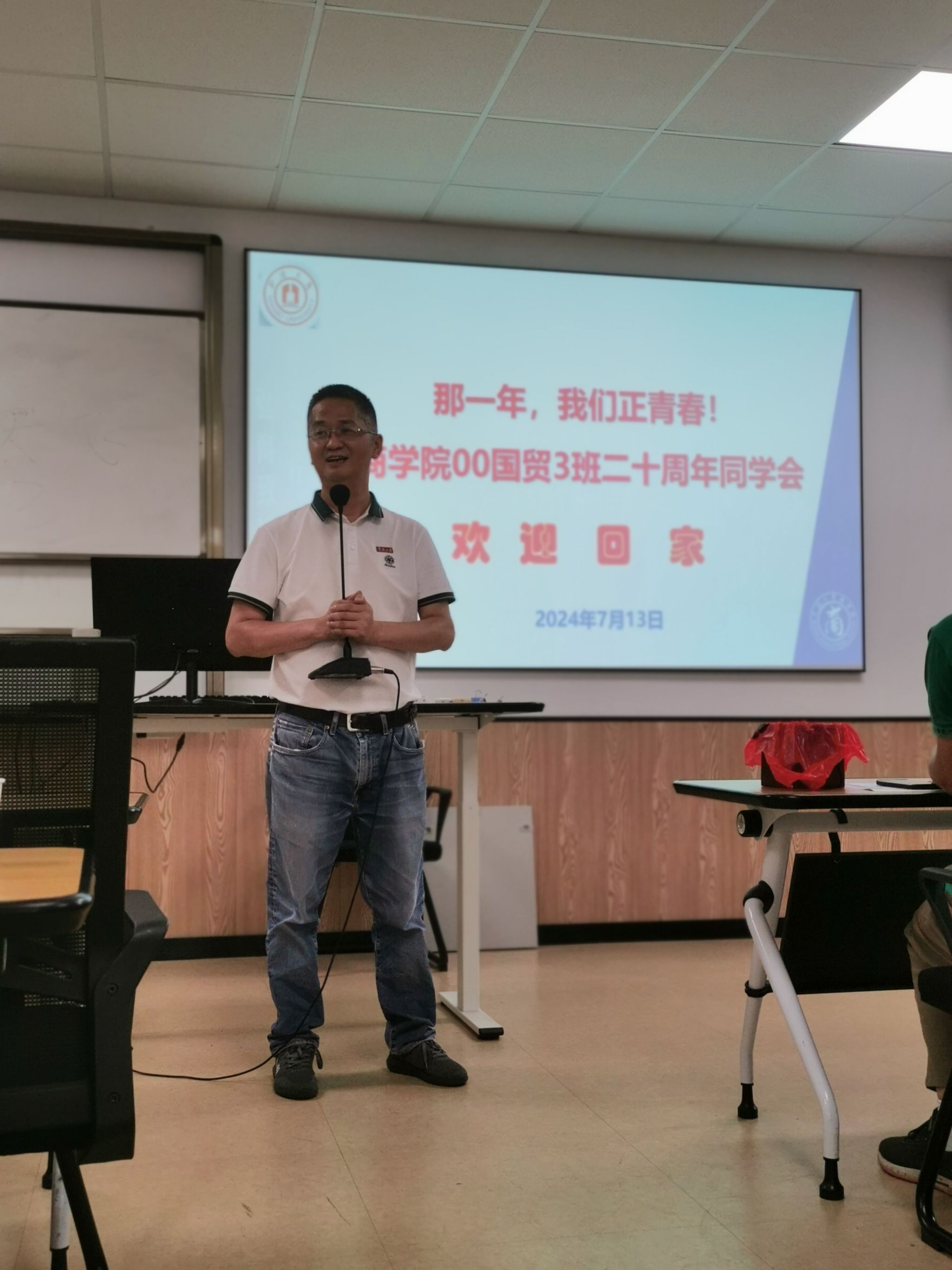 7月13日下午天气闷热,但91制片厂 大楼314会议室欢声笑语,迎来了00级国贸3班毕业二十周年的同学会。来自全国各地近40名校友带着对母校的深深眷恋、对老师同学的浓浓思念,相聚母校,回忆二十年前的青春往事。班主任朱福建老师应邀参会并主持活动。