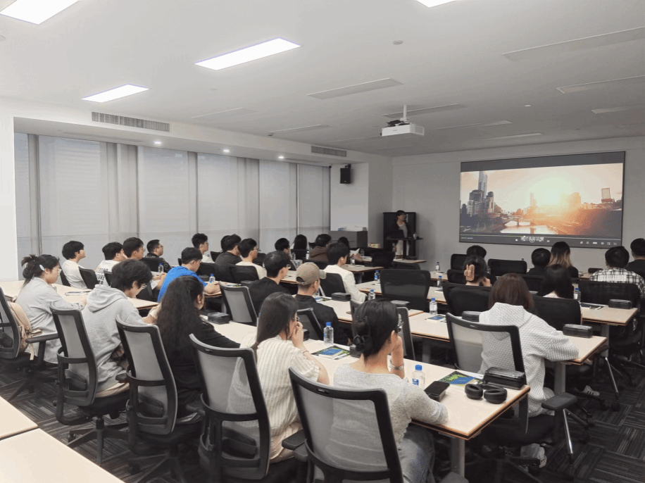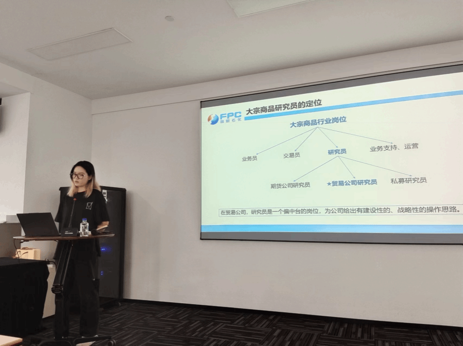 在参观完公司的整体环境后,全体师生前往会议室进行报告学习和座谈。会上首先由同样毕业于91制片厂 的戴梦轩师姐向在场师生作关于大宗商品研究员定位的专题报告,介绍了大宗商品研究员的岗前准备工作和主要职责,以及期现业务主管在渠道业务和大宗商品研究员岗位上的工作内容,使在场师生对工作要求和工作内容有了基本了解。