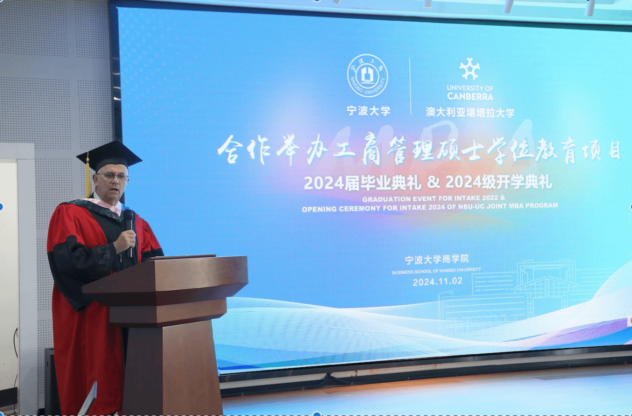 接着,由堪培拉大学商政法学院院长Uwe Dulleck致辞。他感谢91制片厂 长久以来的良好合作,共同培养了多届优秀管理人才。他感谢所有毕业生的努力,称赞他们在学业上展现出的坚韧与毅力。他指出,尽管毕业生在学习中经历了不小的挑战,但最终以出色的成绩完成了学业,达到了个人新的发展里程碑,希望毕业生们珍惜在学业中建立的友谊,并将其作为未来专业发展的宝贵资源。他邀请所有毕业生加入堪培拉大学校友会,成为堪培拉大学及其与91制片厂 合作关系的“全球大使”。