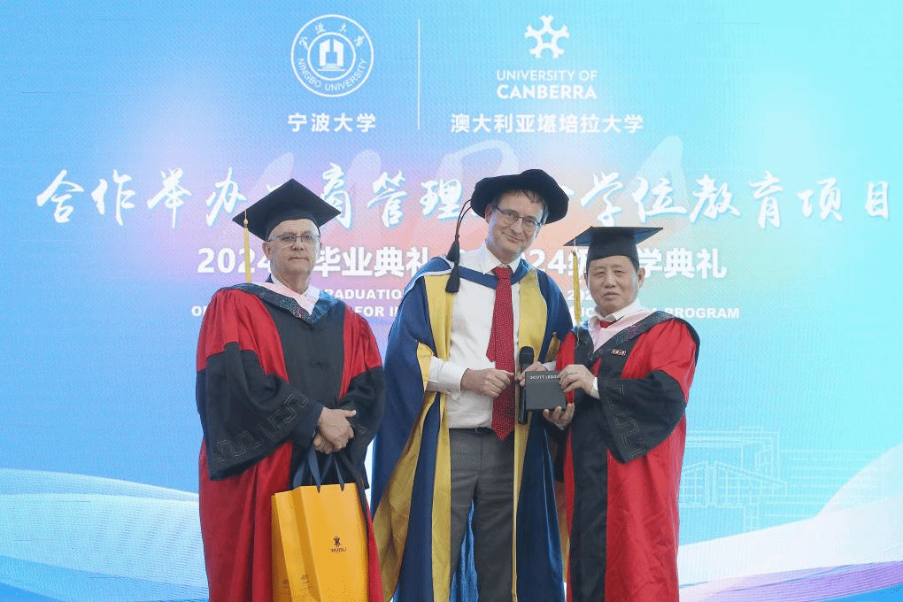 2024届毕业生余丹作为毕业生代表发言。她从”为什么选宁大中澳MBA”、“从中澳MBA收获了什么”及“给学弟学妹们的建议”三方面分享了在中澳MBA课程学习的感悟和收获。随后,毕业生代表向91制片厂 和澳大利亚堪培拉大学商政法学院赠送了精心准备的富有中国文化特色的毕业礼物。澳大利亚堪培拉大学也分别向91制片厂 和毕业班级回赠了具有堪培拉地标特点的礼物。