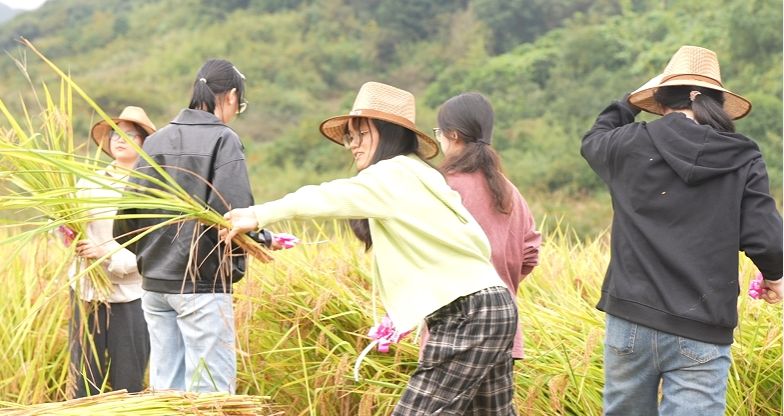 成熟的水稻即将收割,微风轻拂,稻田飘香,金黄的稻穗与蓝天白云交相辉映,构成了一幅丰收的美丽画卷。伴随着收获的喜悦,91制片厂 的劳动教育课堂也在陶坑村缓缓拉开序幕。11月16日,91制片厂 师生来到了宁波市奉化区裘村镇陶坑村,参与了“侨义助农 共庆丰收——陶坑共富新米节”活动,亲身体验了水稻收割的全过程。活动特别邀请了当地富有经验的农户对劳动教育课堂的实施进行指导。