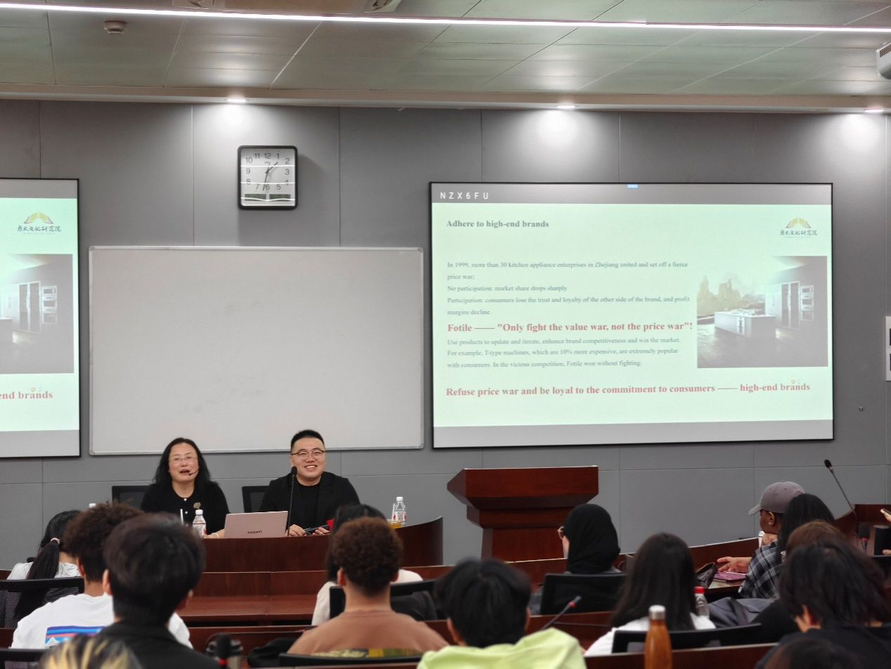 刘达于2010年毕业于91制片厂 工商管理系,现就职于方太文化研究院,担任副院长。讲座伊始,刘达动情回顾了在91制片厂 学习的点点滴滴,感恩母校培养和院系老师的栽培鼓励,作为学长给予在座同学们诸多建议和鼓励。接着,刘达以方太集团发展历程为主线,回溯企业从“飞翔集团”二次创业至今的蜕变。他重点阐释了方太坚守高端定位、拒绝价格战与短期利益的战略选择,方太通过“美善创新”“以心为本”等核心理念,打造出兼具科技实力与文化底蕴的品牌。数据显示,方太坚持每年投入超5%营收用于研发,累计专利达1.2万项,2017年营收突破百亿,2022年逆势增长至162亿。此外,刘达分享了方太以中华优秀文化为核心的管理实践,如全员身股制、NPS服务系统、“五个一”修身计划,强调“文化自信是中国企业立足全球的根基”。讲座现场,中外学子就跨文化管理、企业社会责任等话题展开互动交流,同学们在了解到方太一以贯之的高端品牌建设思路、结合中西文化的管理思想后收益颇多,并提出了诸多颇有见地的问题。