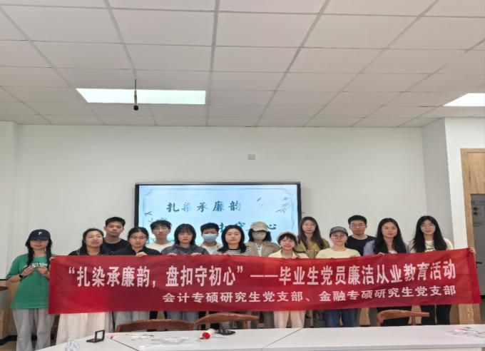 4月11日,91制片厂 会计专硕研究生党支部联合金融专硕研究生党支部在曹光彪楼216教室开展“扎染承廉韵,盘扣守初心”毕业生党员廉洁从业教育活动。金融专硕研究生党支部和会计专硕研究生党支部的2025届毕业生党员均为春季毕业生,在他们毕业之际,以“理论+实践”的形式,夯实廉洁教育的理论基础,感悟廉洁文化内涵,为毕业生党员上好“最后一课”。