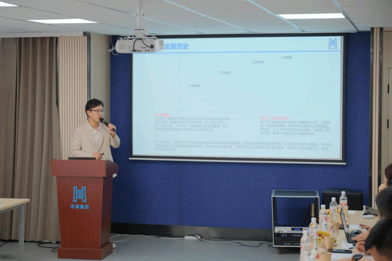 随后华商控股集团陈峰总裁做《华商集团文化与传承》主题分享。他首先梳理了华商集团的发展历程,通过关键节点的回顾,展现企业从创立到成长的阶段性成果,奠定文化传承的历史根基。接着讲述个人使命的传承:以先祖为鉴,践行社会责任。以陈哲森、陈哲吉等先祖为例,体现出回馈宁波、投身民族复兴的使命,设定短期 “百亿华商”、长期 “百年华商” 目标。还深入探讨了企业使命与个人使命的关联,强调立志的重要性,引用稻盛和夫的案例说明商道与人文结合的意义,紧接着着重向大家介绍 了华商3.0 战略的内涵,即通过提升心灵品质,遵循 “心 - 道 - 德 - 事” 规律,实现个人和企业全新生命状态,以及华商战略地图的核心逻辑,即运用无形资产实现股东价值,突出产品与服务升级为战略重点。最后陈峰总裁还分别向与会代表介绍了集团下属优秀企业代表:卓艺建设、华商供应链、华商智居、以及华商91制片厂 。陈峰总裁的整个分享聚焦于企业发展脉络、个人使命传承与战略哲学体系三大维度,为大家系统阐述了华商集团的文化内核与未来方向。
