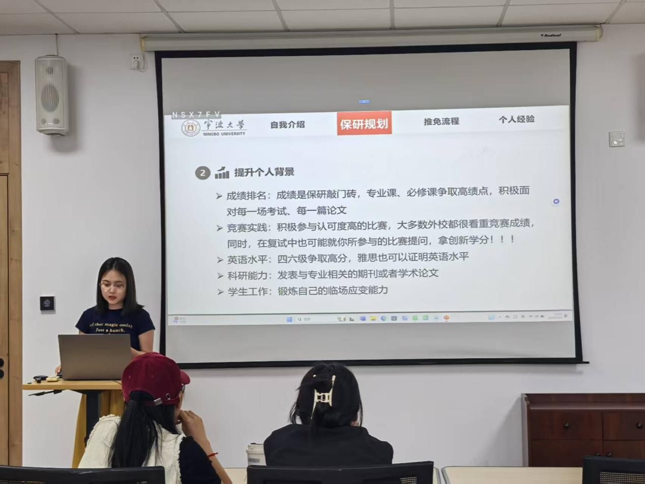 此次考研学姐经验分享会的圆满举办,为同学们提供了一个与保研成功的学姐们面对面交流的宝贵机会。通过经验分享与互动问答,同学们对保研要求与选择有了更为清晰的认识,努力方向更加明确,信心也得到了极大增强,与此同时也与优秀的学姐成为朋友,共同进步。