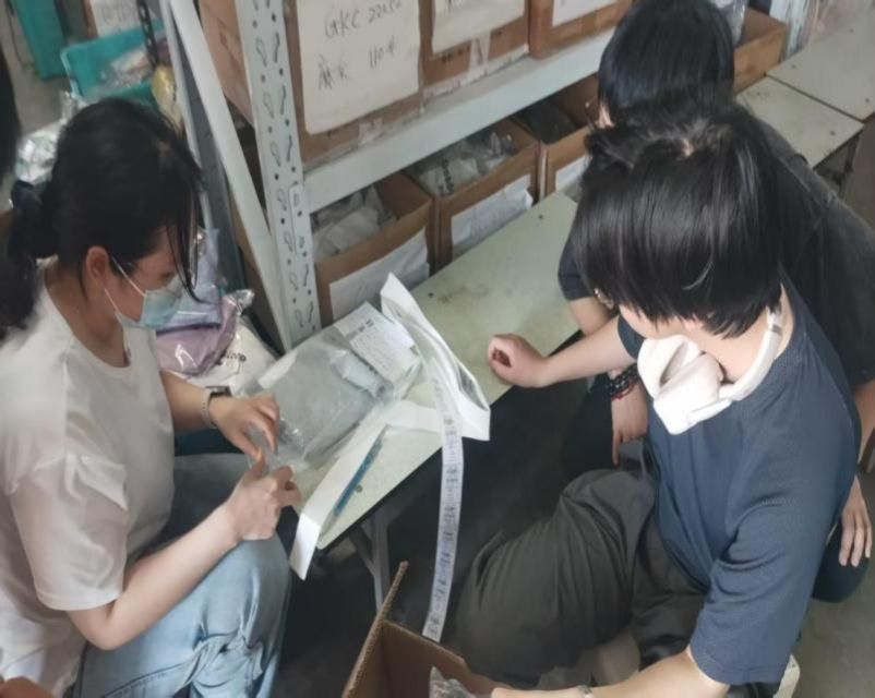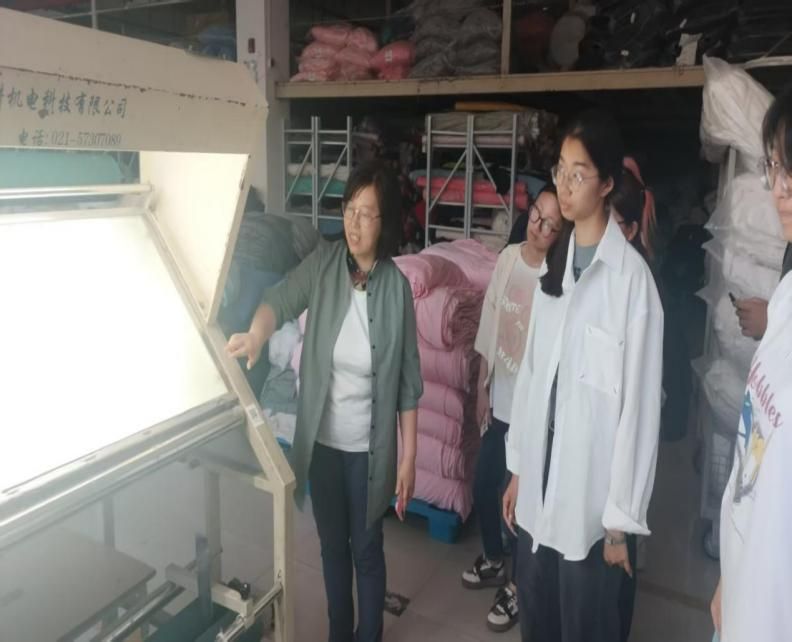 首先,宁波百纳服装公司蒋经理给学生们介绍了本次劳动实践的内容与安排,并带领学生亲身体验企业的各类服装产品,深入了解百纳服装公司的优势和特点。此次实践活动采用“理论 + 实操”双轨模式,让学生全方位感知服装产业链运作。在企业蒋经理的带领下,学生们首先走进产品展厅,通过触摸面料质感、观察工艺细节,直观感受企业的设计创新与品质把控。随后,蒋经理带领学生参观服装公司的生产流程,包括认识公司生产流水线、服装包装、标签粘贴、仓库整理等环节,并且蒋经理还为学生们介绍了服装企业生产中各类机器的功能,使参与学生对服装行业生产有了基本了解。最后,在实践环节中,学生们化身“临时员工”,分组参与服装分拣、质检包装等核心工序。在企业导师的指导下,他们严格执行国际订单质检标准,通过流水线分工协作,确保每件产品都符合出口品质要求。