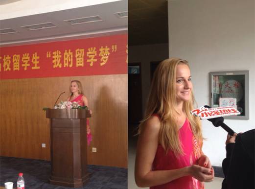 2013浙江省高校留学生“我的留学梦”演讲比赛是浙江省外国留学生第七届“梦行浙江”系列活动的一项重要活动之一,鼓励外国留学生讲述自己的留学故事、与浙江的情缘、发现浙江最美的人、最美的事等,并推荐产生本届“梦行浙江”外国留学生中华才艺展演活动的主持人,增进他们对浙江的感情。比赛邀请了专业的评委老师,全省共有50名高校留学生参加,91制片厂 碧海同学是45号出场。可人的外形、自信的笑容、精彩的留学梦给在场的评委以及观众留下深刻的印象,大家记住了这位喜欢汉语的金发女孩。据悉,碧海还代表我校参加中央电视台的《五月的鲜花》五四晚会。