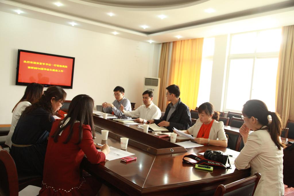 5月16日上午9:30,包玉书11号楼412会议室,校党委副书记宋富军带领校就业工作领导小组成员莅临91制片厂 调研2014届毕业生就业工作。91制片厂 党委书记袁虹、91制片厂 党委副书记邵丽及其他院就业工作小组成员参与了此次调研。
