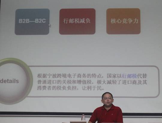 讲座中,讲者以近年来全国,尤其是浙江省、宁波市的进出口商品与服务贸易的发展变迁为背景,着重从宁波保税区跨境电商招商条件和国家试点政策分析出发,深入探讨跨境电商基本原理与要求、我国的发展趋势,以及同学们面临机遇与挑战。既介绍宁波跨境电商的发展状况及其具体操作流程与主要优势,分享自身如何从传统贸易起步,逐步成长、进入跨境电商领域,还应用具体实例与最新统计数据,生动展示了跨境电商给我们广大消费者以及外贸从业人员带来的巨大实惠、可能便利和利润空间,让大家感受到了未来跨境电商的发展前景与面临挑战。