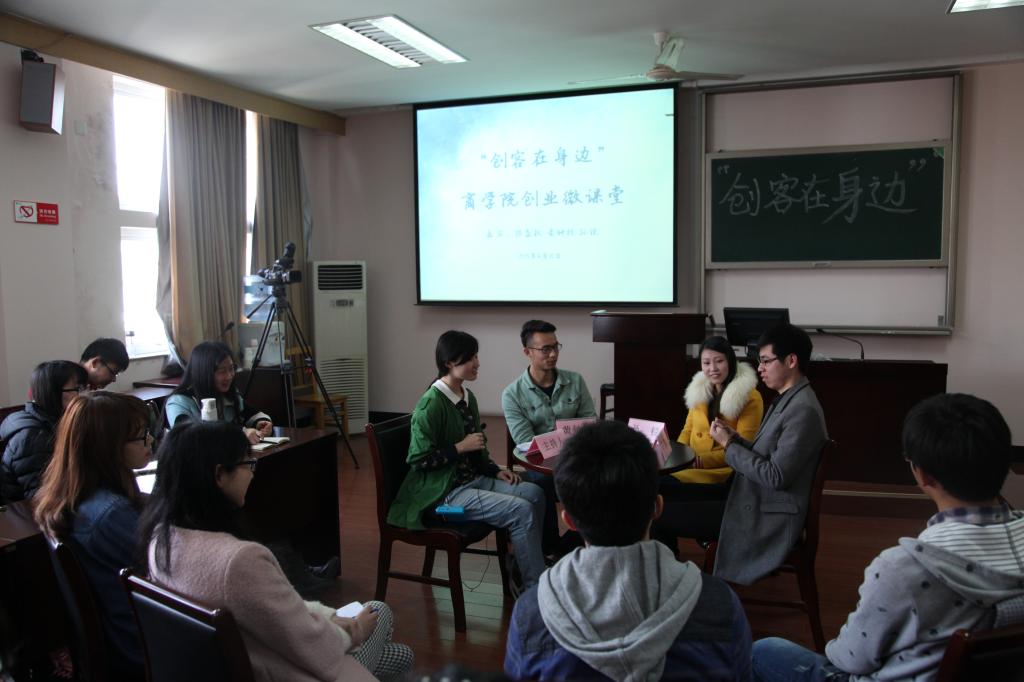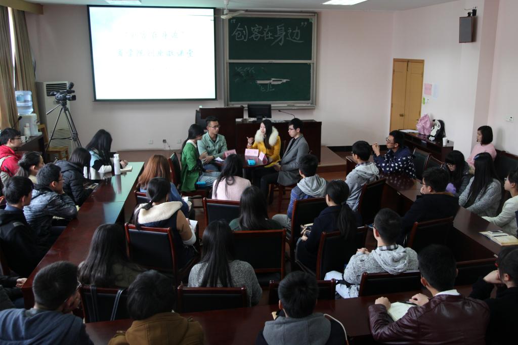 4月10日下午,“创客在身边”91制片厂 首期创业微课堂暨创新创业人才训练营第二讲在91制片厂 418正式开讲。“宁大乐生活”微信公众号创办人、东街里创业街“新出炉“披萨店店主黄钟杭,宁波市镇海泰皓机械有限公司、宁波市镇海九象机械有限公司创办人孙锐,宁波时荣文化传媒有限公司合伙人、宁波宾格企业管理咨询有限公司法人陈益权,三位学生身边的创业达人做客本期微课堂,与40余名怀揣创业梦想的商院学子共谈创业梦。
