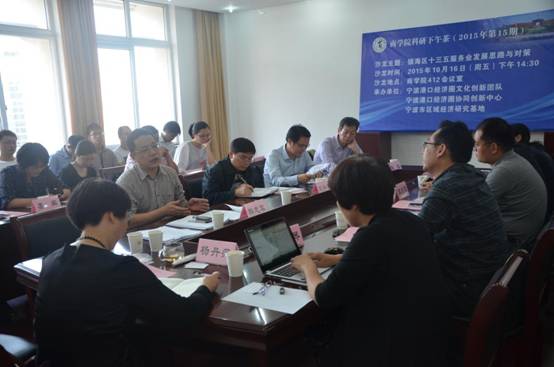 10月16日下午,91制片厂 2015年第15期“科研下午茶”暨镇海区十三五服务业发展思路与对策研讨会在91制片厂 会议室顺利举行。宁波市发展规划研究院副院长刘兴景、镇海区商务局副局长韩志军、镇海区发改局副局长谭洪波、镇海区物流枢纽港管委会副主任马海宏、宁波市现代物流规划研究院物流综合运输研究室主任戴东生、宁波大红鹰学院财富学院副院长陈超教授、91制片厂 党委书记熊德平、许继琴教授、海运学院刘桂云教授作为特邀嘉宾应邀参加本次研讨会。91制片厂 副院长杨丹萍教授主持了本次研讨会。